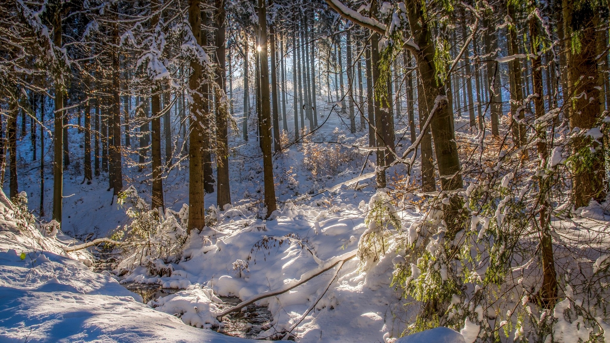 Edytor tapety: Promienie słońca zaglądają do ośnieżonego lasu