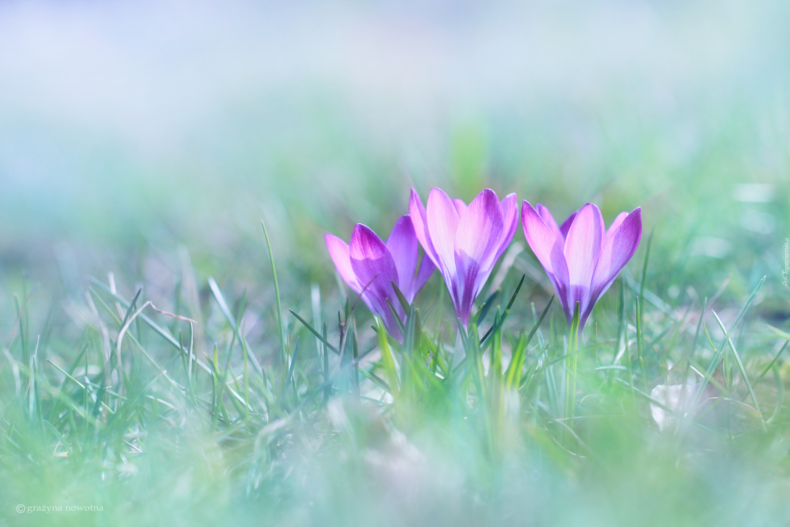 Edytor tapety: Oświetlone słońcem trzy liliowe krokusy