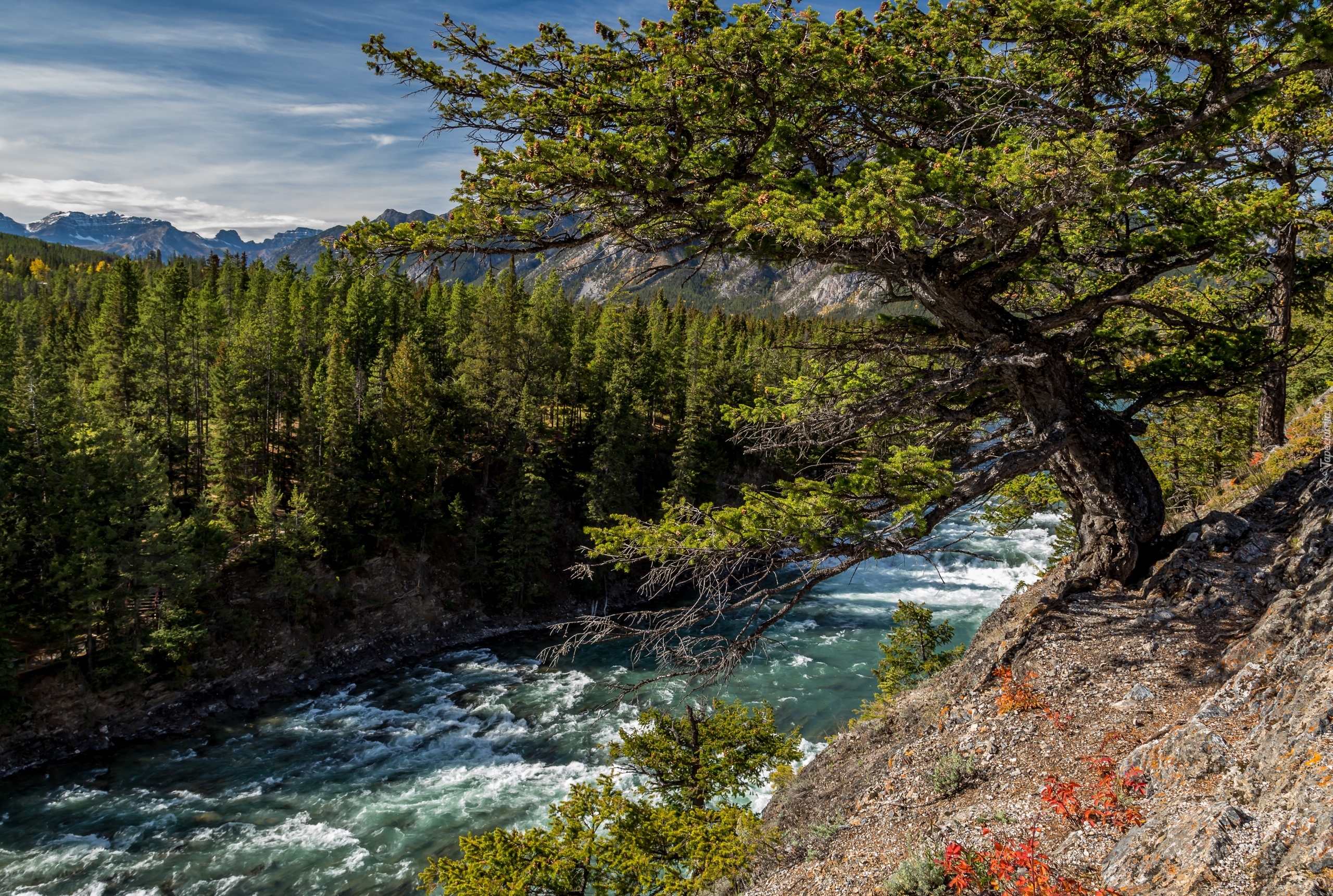 Edytor tapety: Pochylone drzewo nad rwącą rzeką