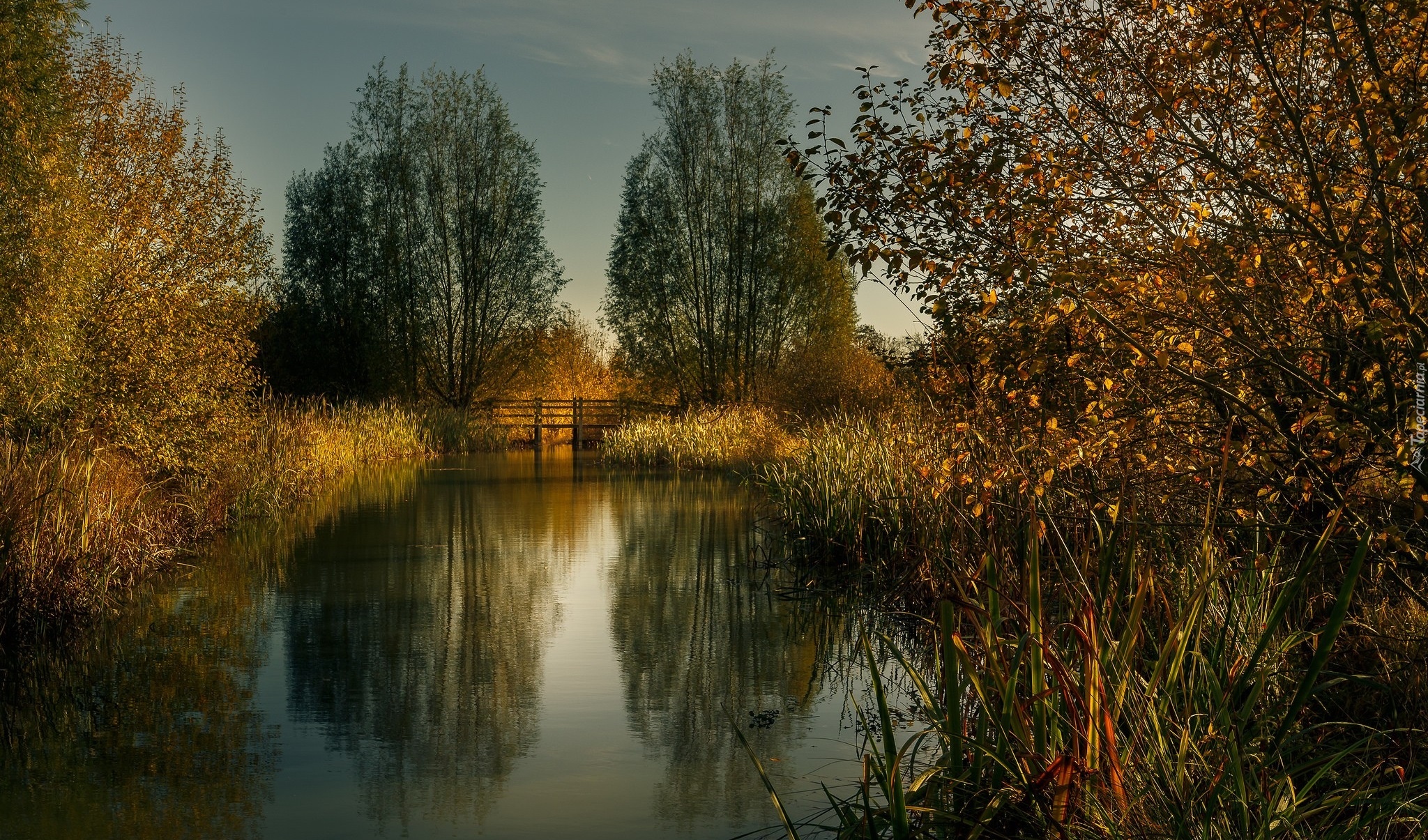 Edytor tapety: Roślinność i drzewa nad rzeką nieopodal mostku