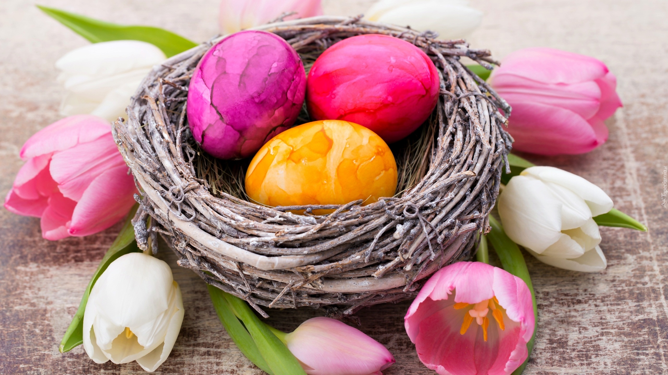 Edytor tapety: Gniazdo z pisankami otoczone kolorowymi tulipanami