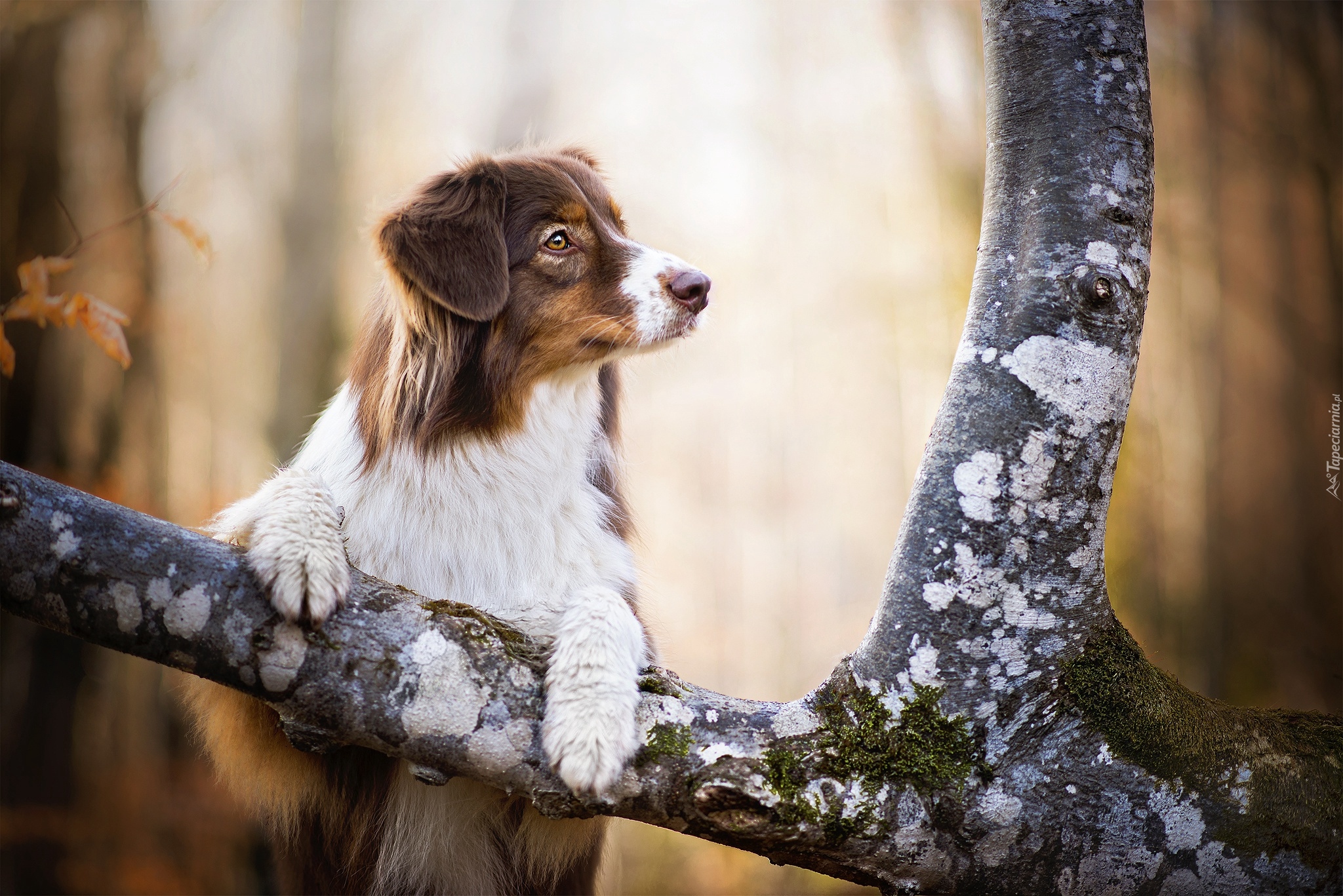 Edytor tapety: Owczarek australijski oparty łapkami o drzewo