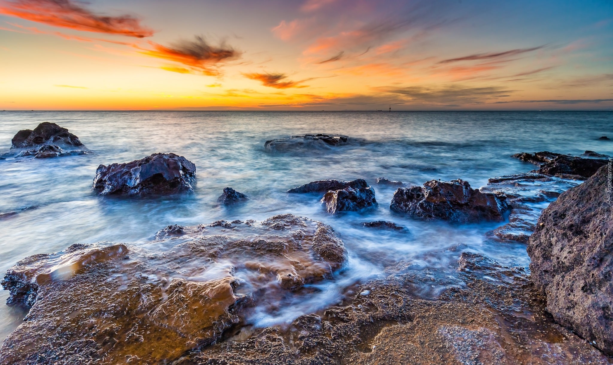 Edytor tapety: Kamienisty brzeg morza o wschodzie słońca