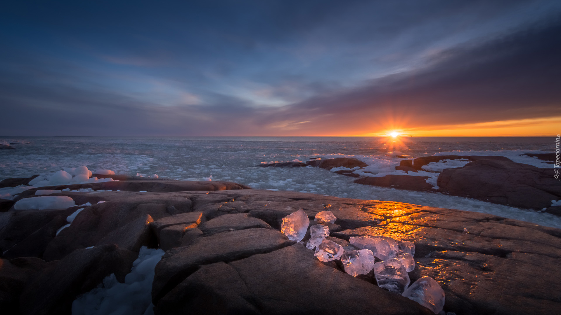 Edytor tapety: Lód nad brzegiem oceanu w promieniach zachodzącego słońca