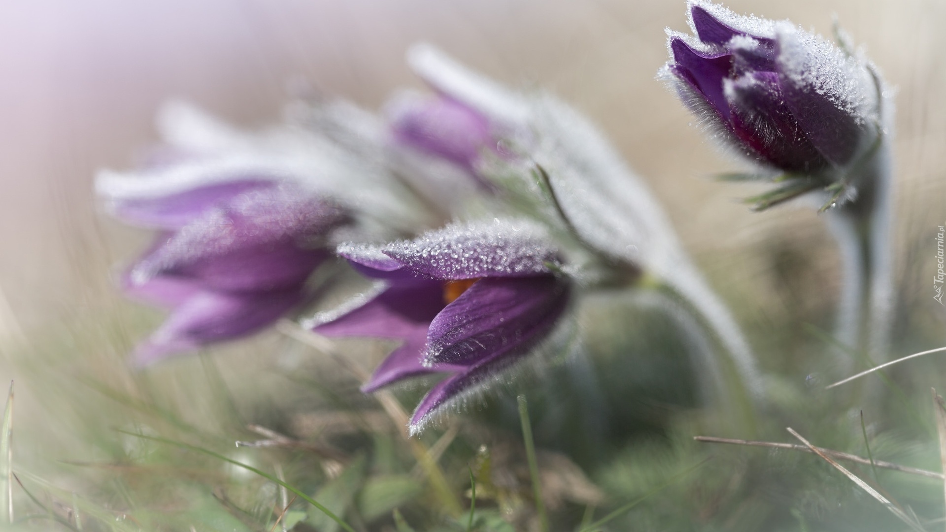 Edytor tapety: Rozmyte fioletowe sasanki w trawie