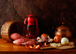 Edytor tapety: Warzywna kompozycja z batatów, cebuli i czosnku obok lampy naftowej