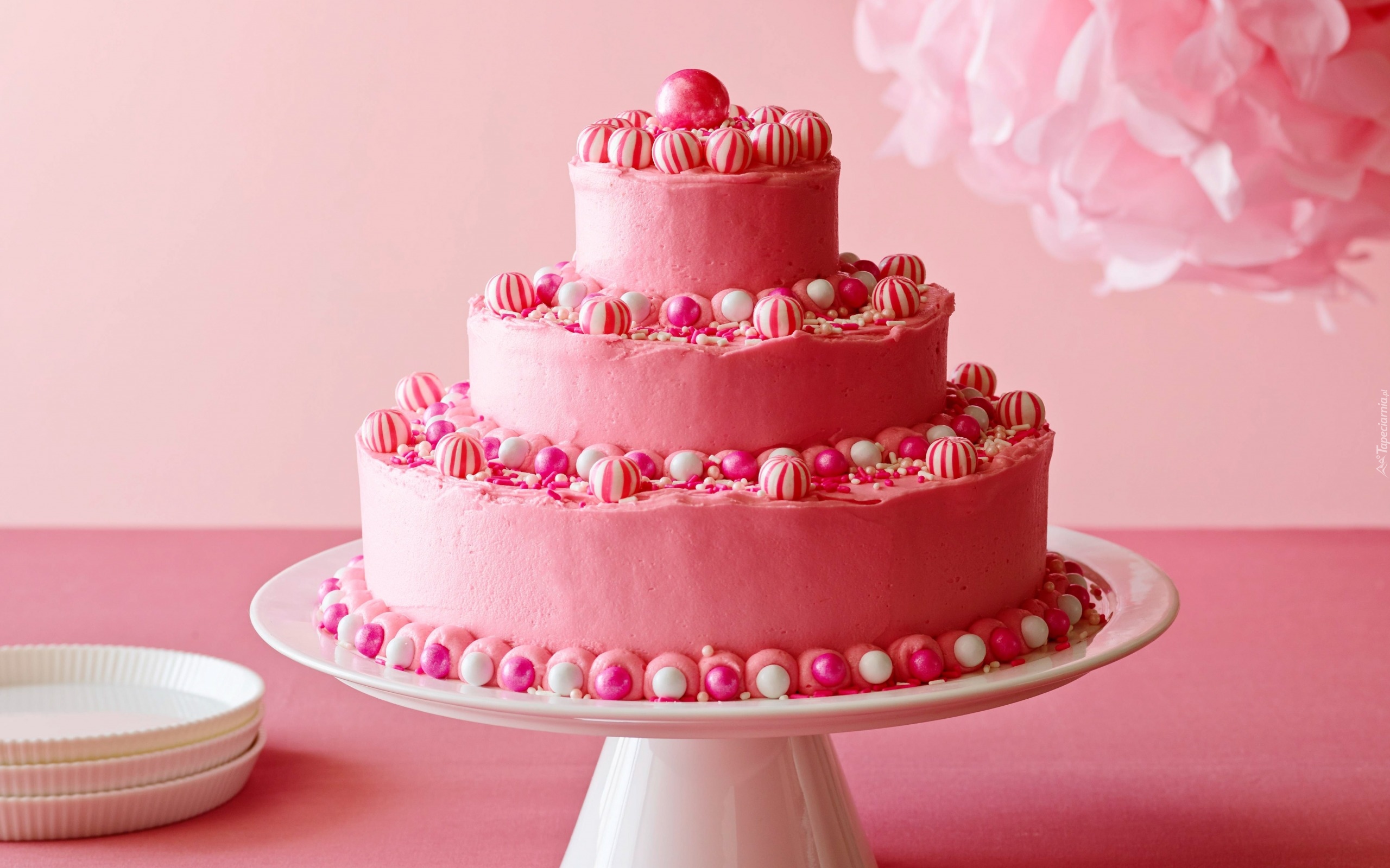 Edytor tapety: Różowy trzypiętrowy tort ozdobiony kuleczkami