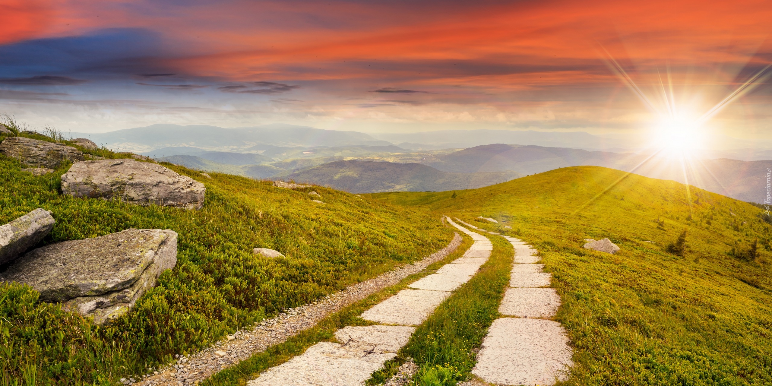Edytor tapety: Wschodzące słońce nad wzgórzami z kamienną drogą