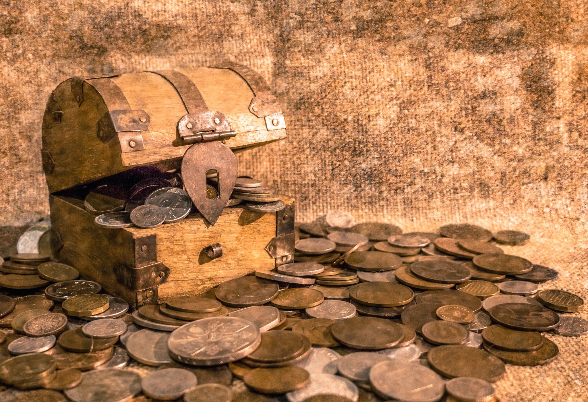 Edytor tapety: Monety w skrzyni i rozsypane wokół niej