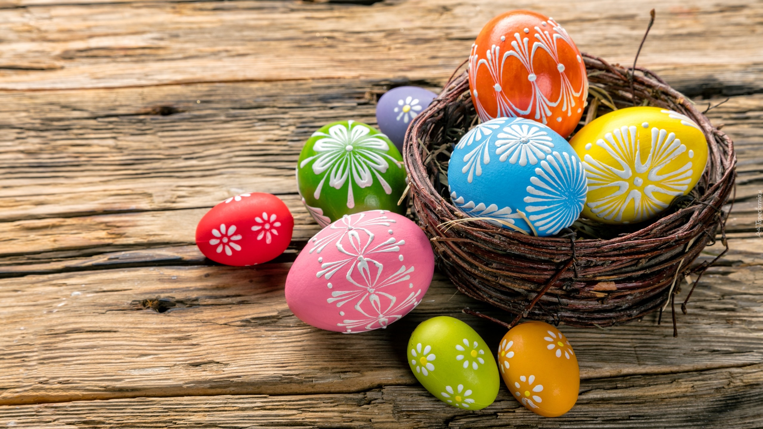 Edytor tapety: Kolorowe pisanki w koszyczku i na drewnianym blacie