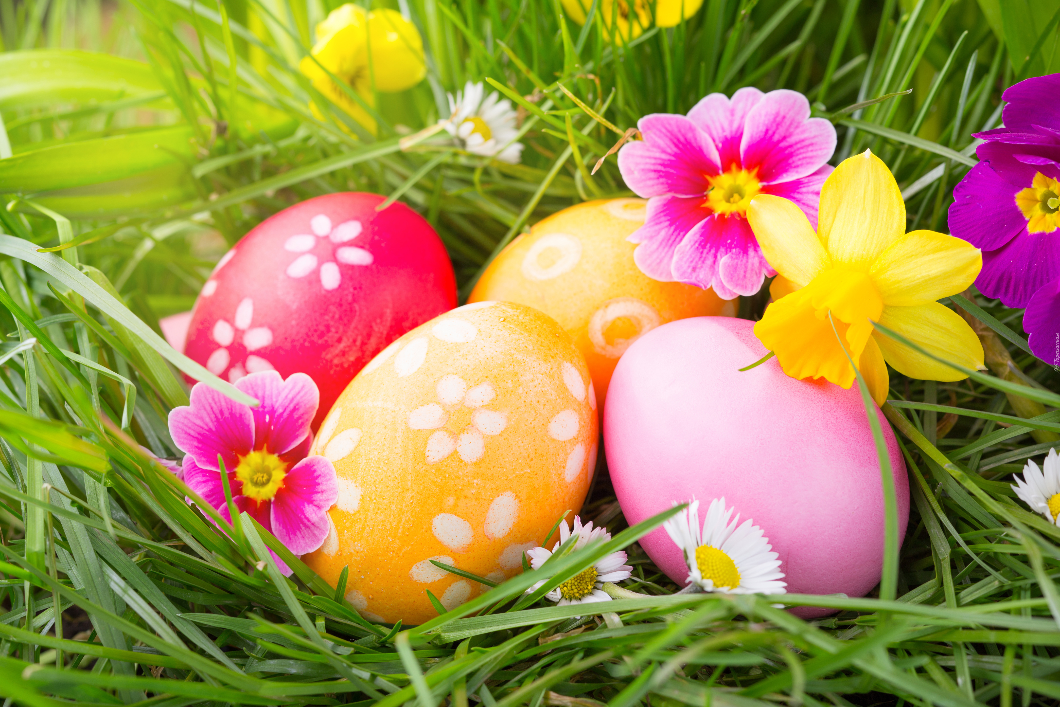 Edytor tapety: Kompozycja z wielkanocnych pisanek i kwiatów w trawie