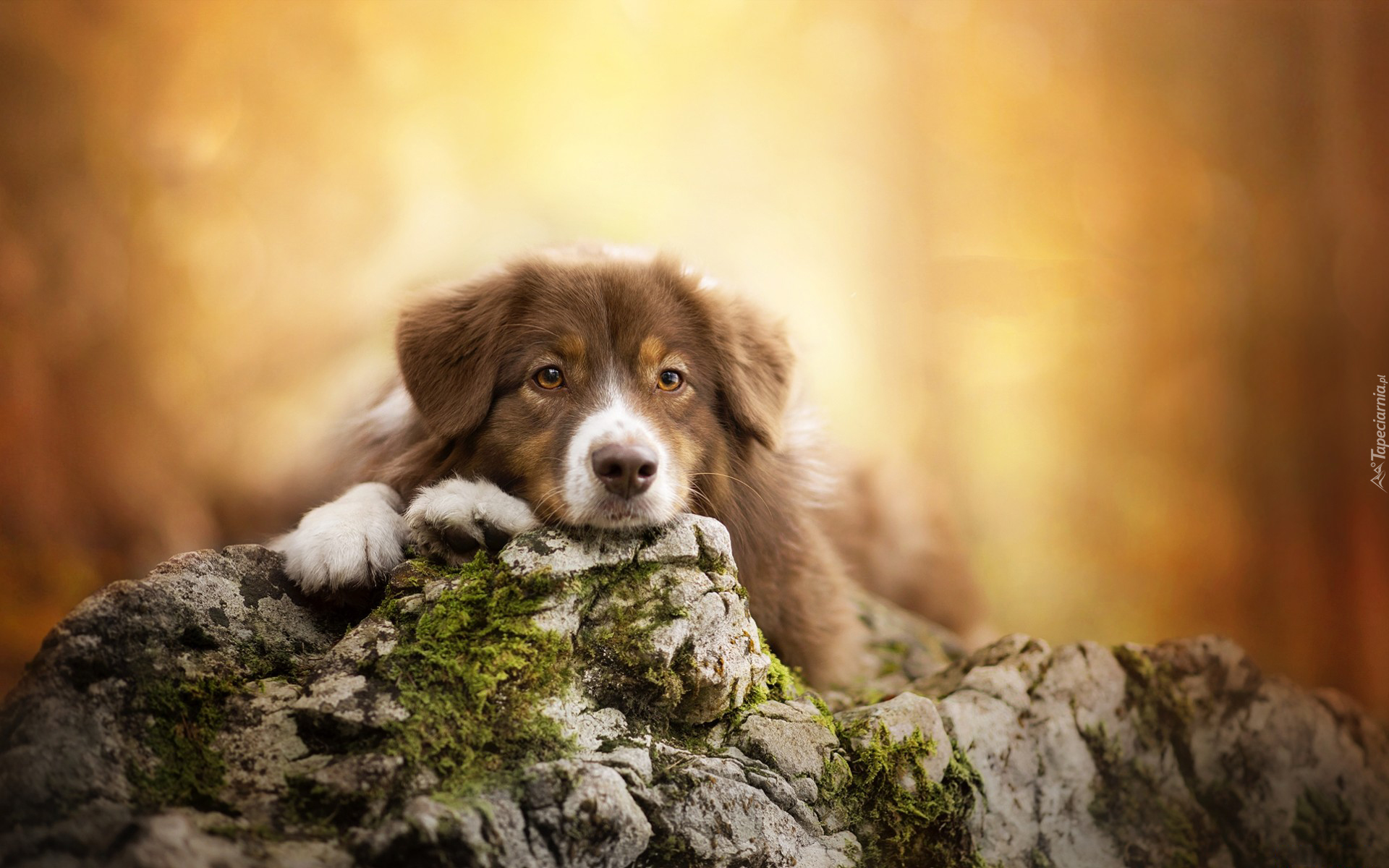 Edytor tapety: Owczarek australijski oparty mordką i łapkami o skałę