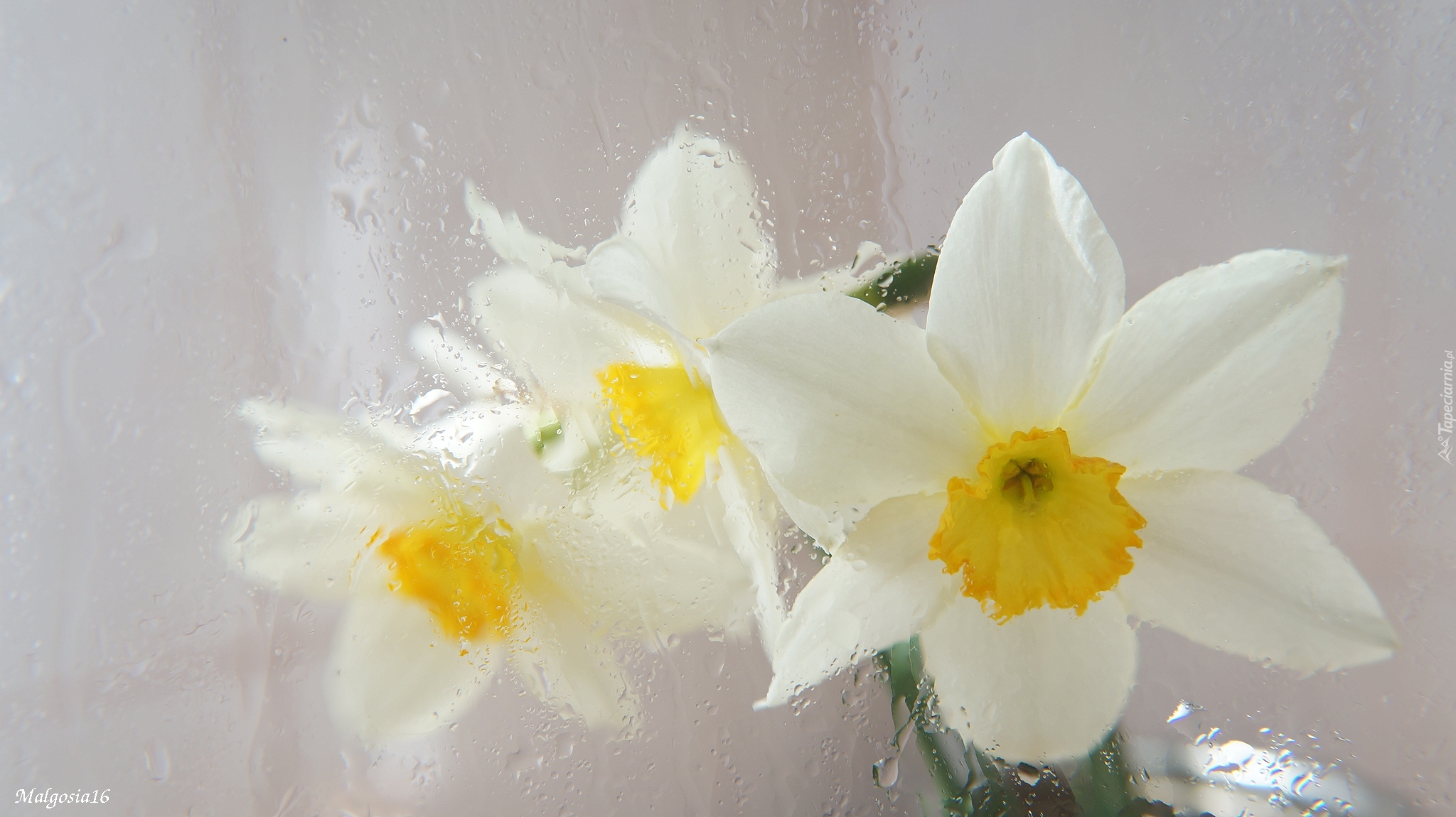 Edytor tapety: Bukiet białych narcyzów za szybą w deszczu