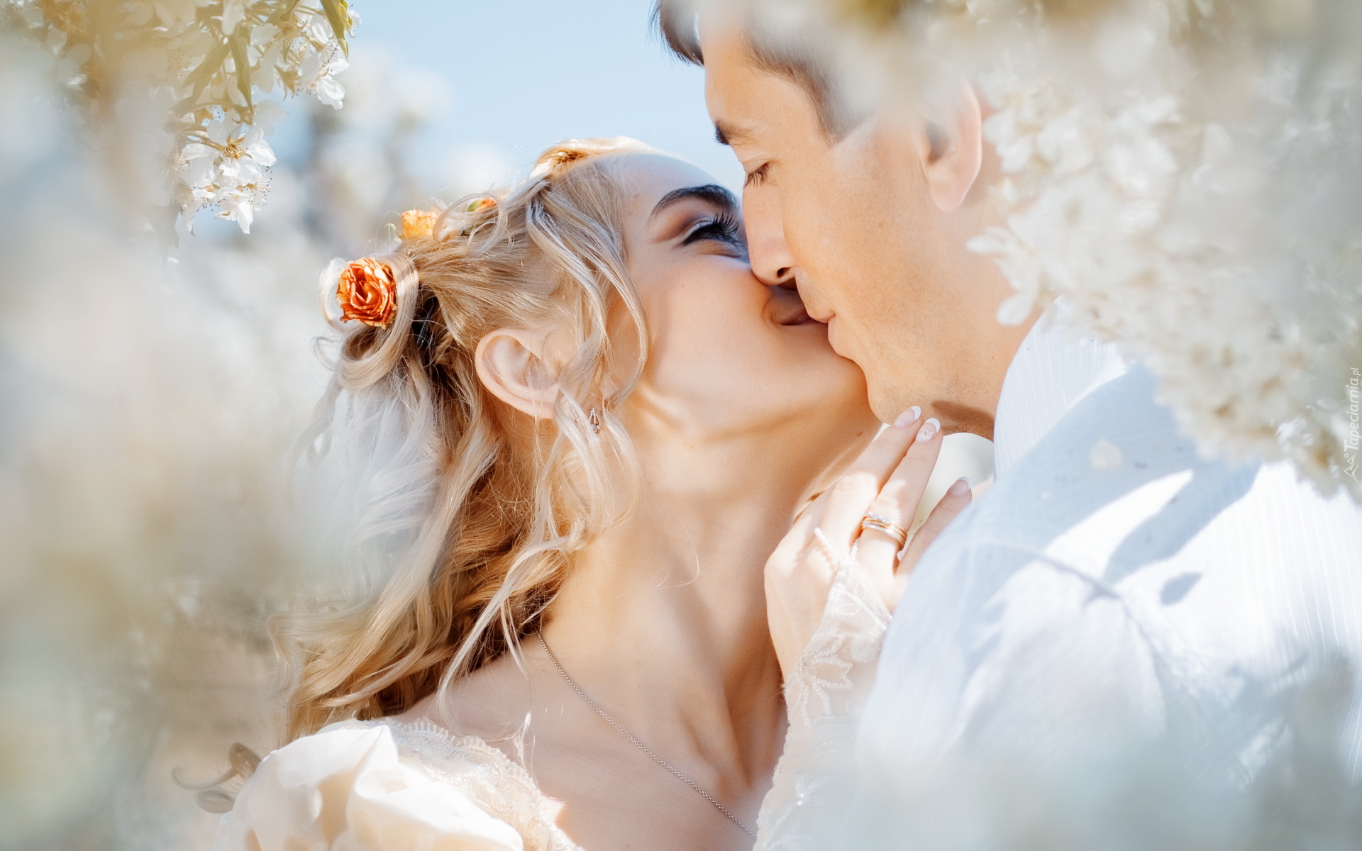 Edytor tapety: Pocałunek nowożeńców pod kwitnącymi gałązkami