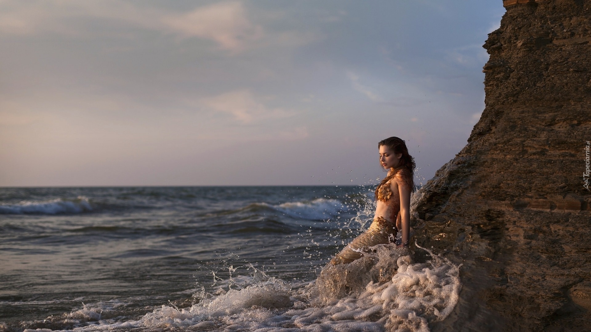 Edytor tapety: Kobieta - Syrena w spienionych morskich falach przy skale