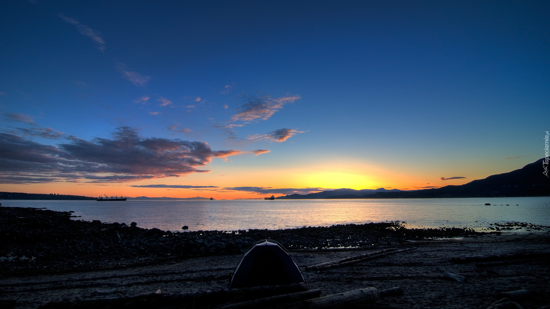 Edytor tapety: Namiot nad jeziorem w blasku zachodzącego słońca