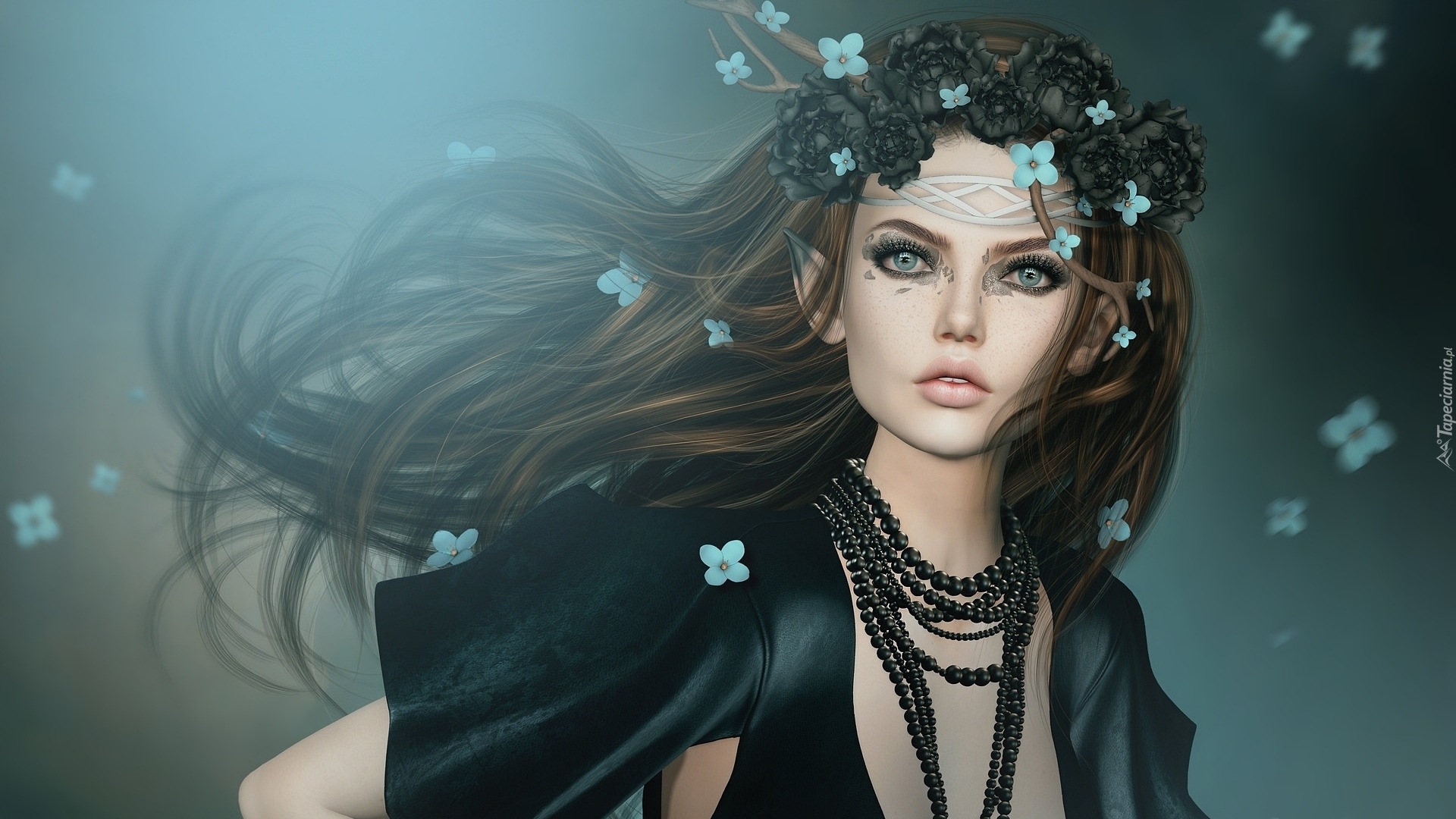 Edytor tapety: Elf w wianku wśród niebieskich kwiatków