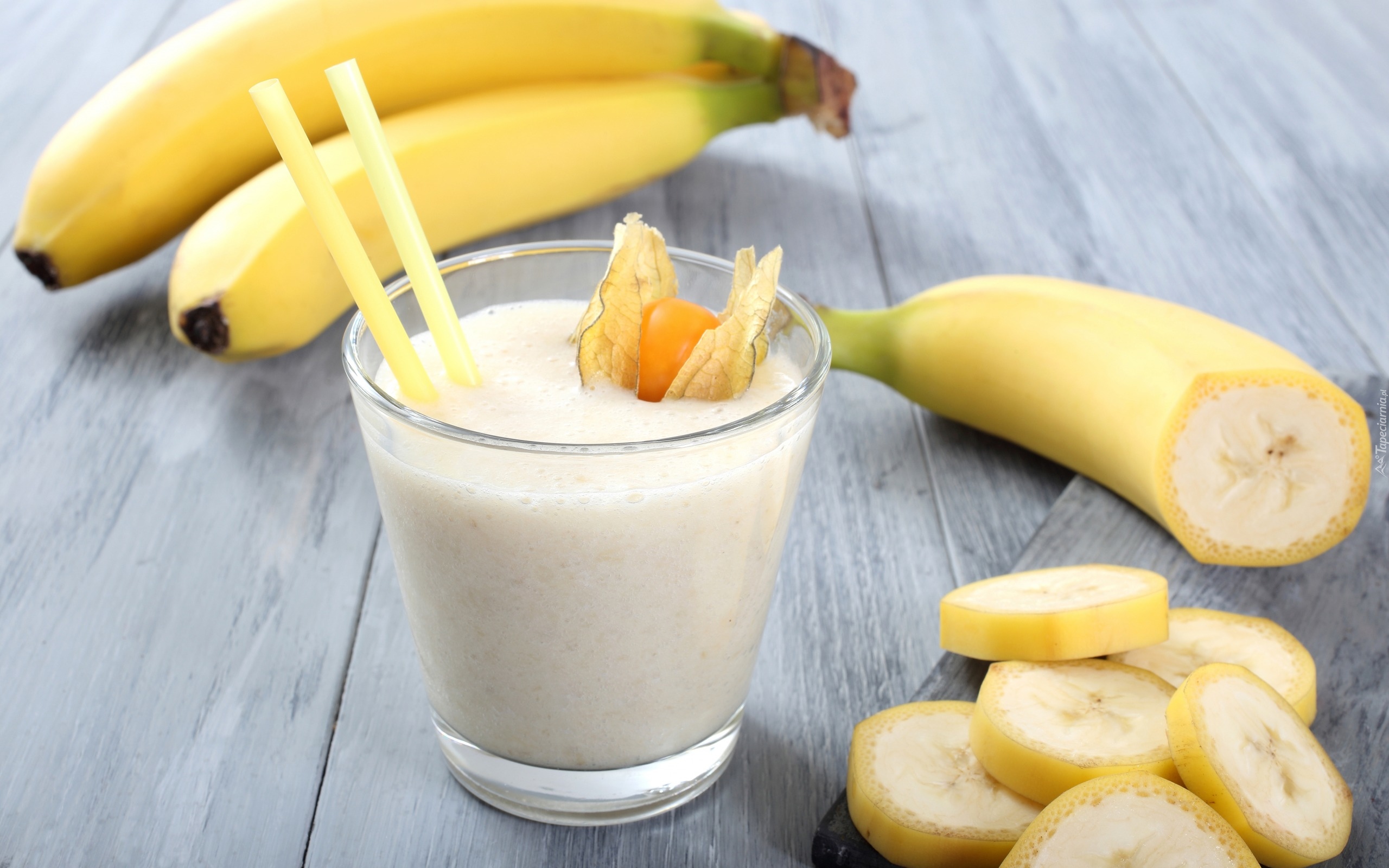 Edytor tapety: Kawałki banana obok koktajlu w szklance