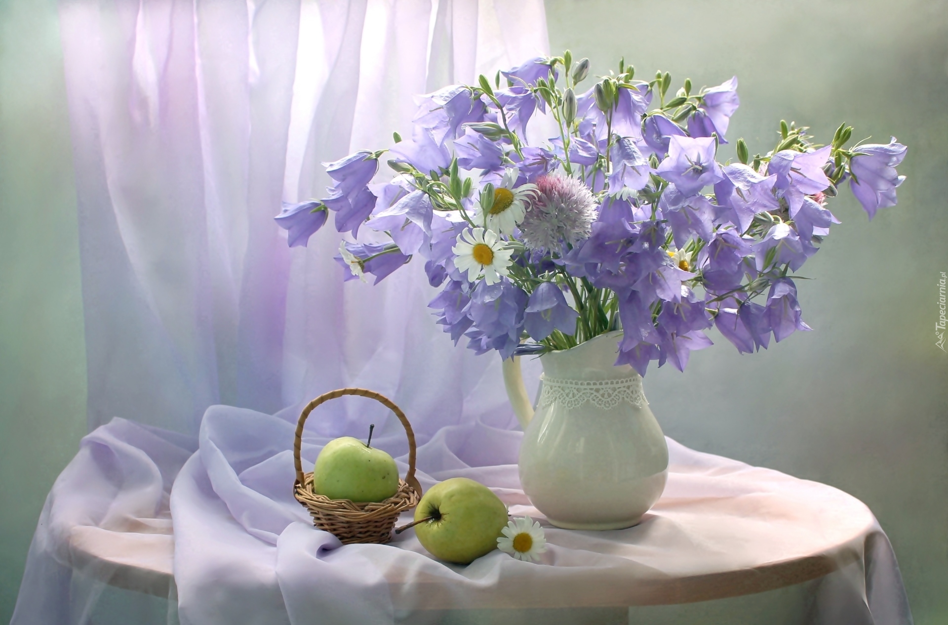 Edytor tapety: Fioletowe dzwonki w dzbanku i zielone jabłka