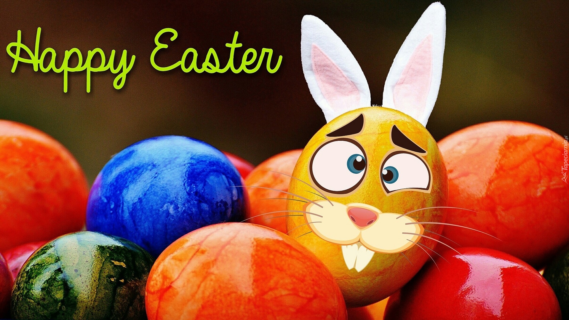 Edytor tapety: Kolorowe pisanki z namalowanym zajączkiem i życzeniami