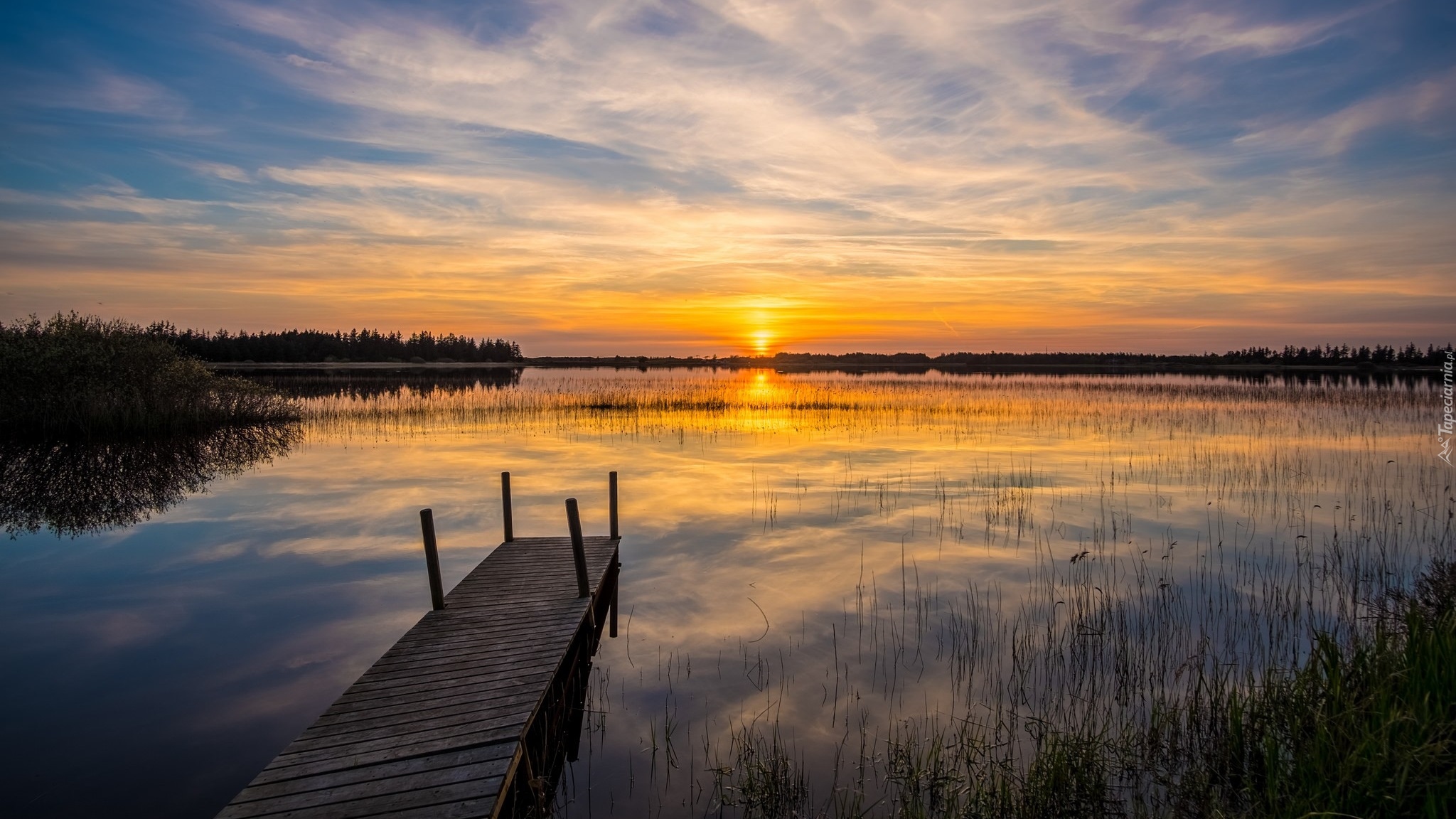 Edytor tapety: Pomost wychodzący na jezioro w blasku wschodzącego słońca