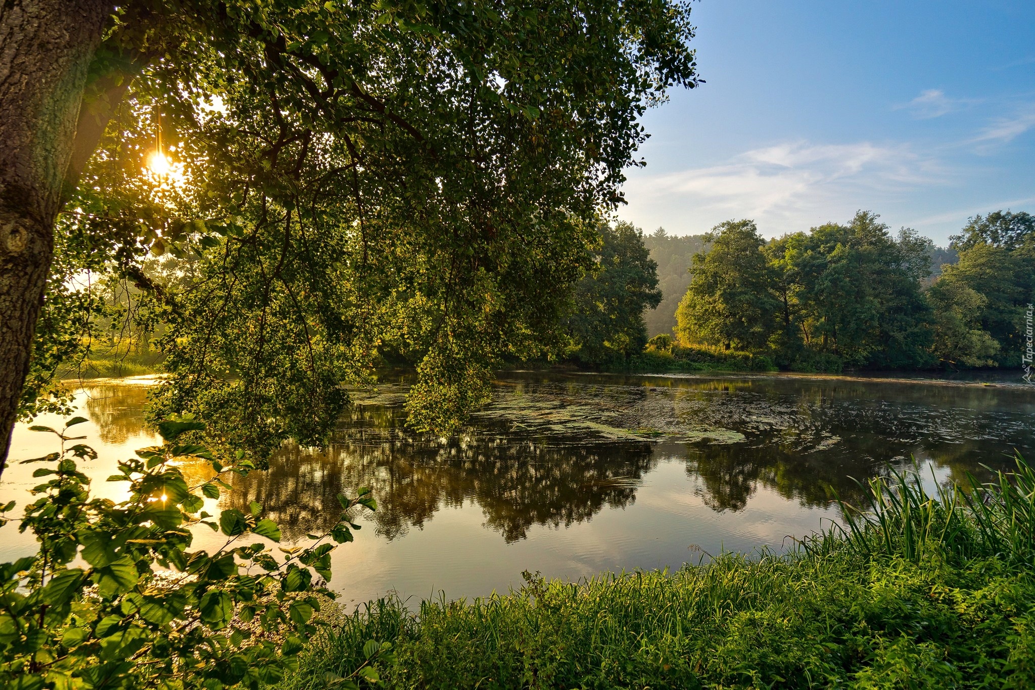 Edytor tapety: Wschodzące słońce za drzewami nad rzeką