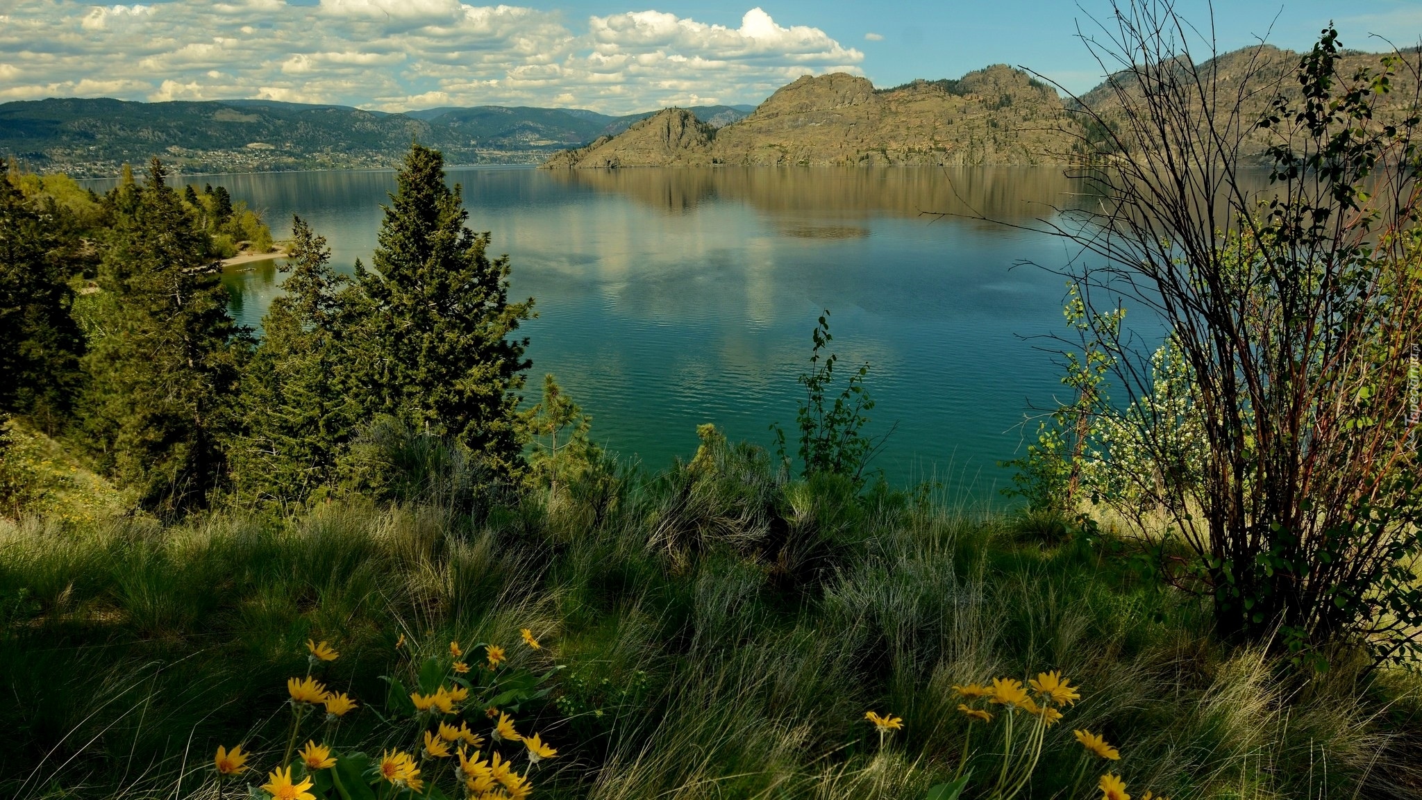 Edytor tapety: Widok na wzgórza z brzegu rzeki porośniętego roślinnością