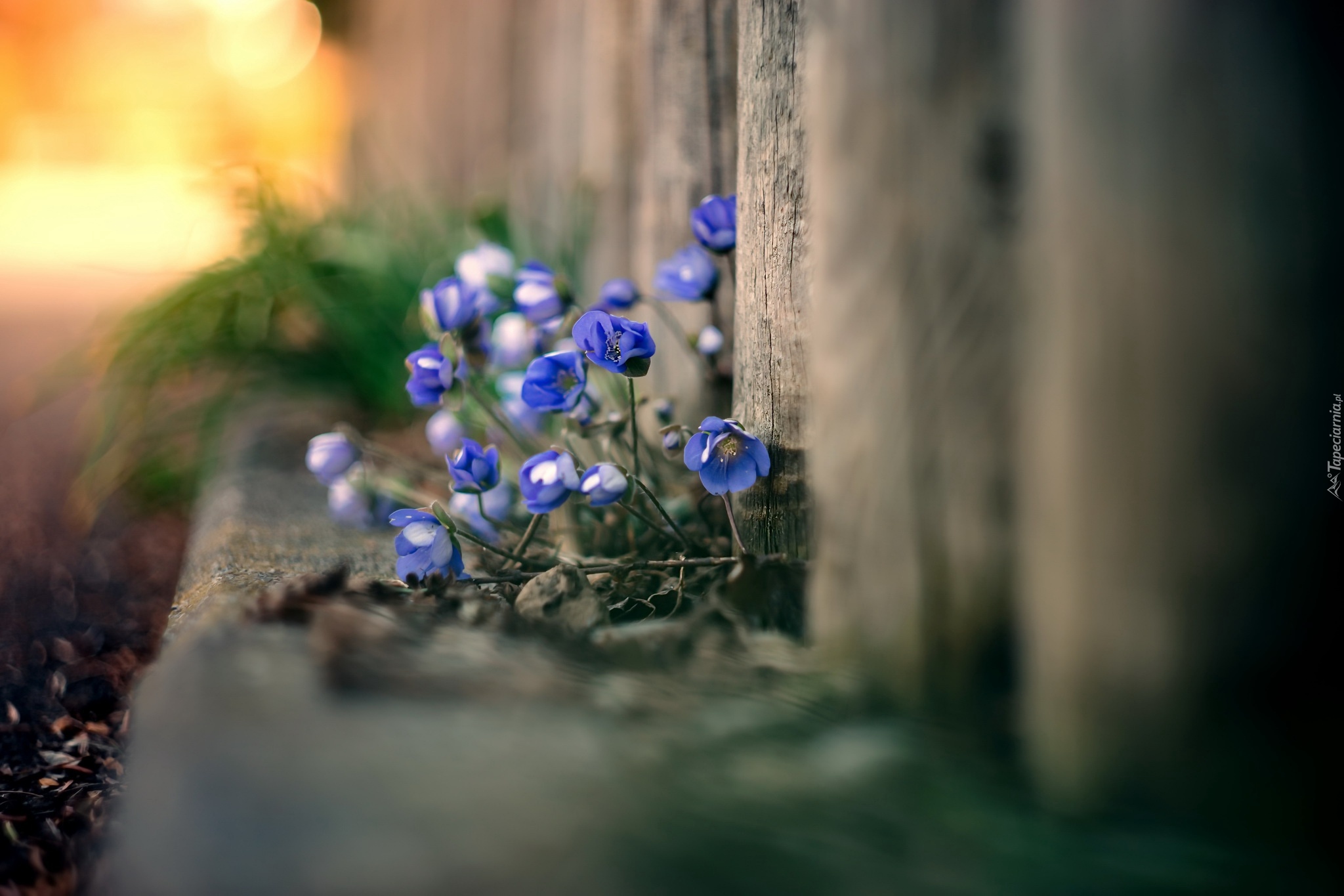 Edytor tapety: Niebieskie przylaszczki rosnące przy płocie