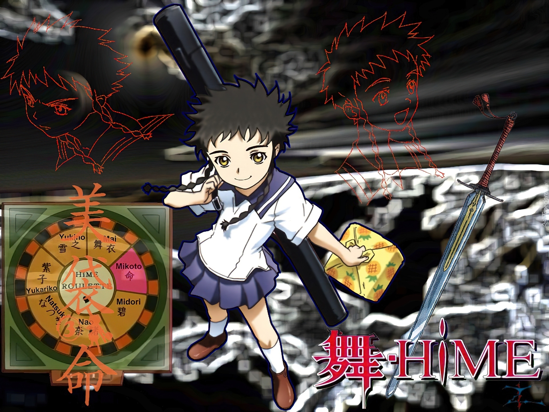 Edytor tapety: Mai Hime, tarcza, miecz, osoba, napisy