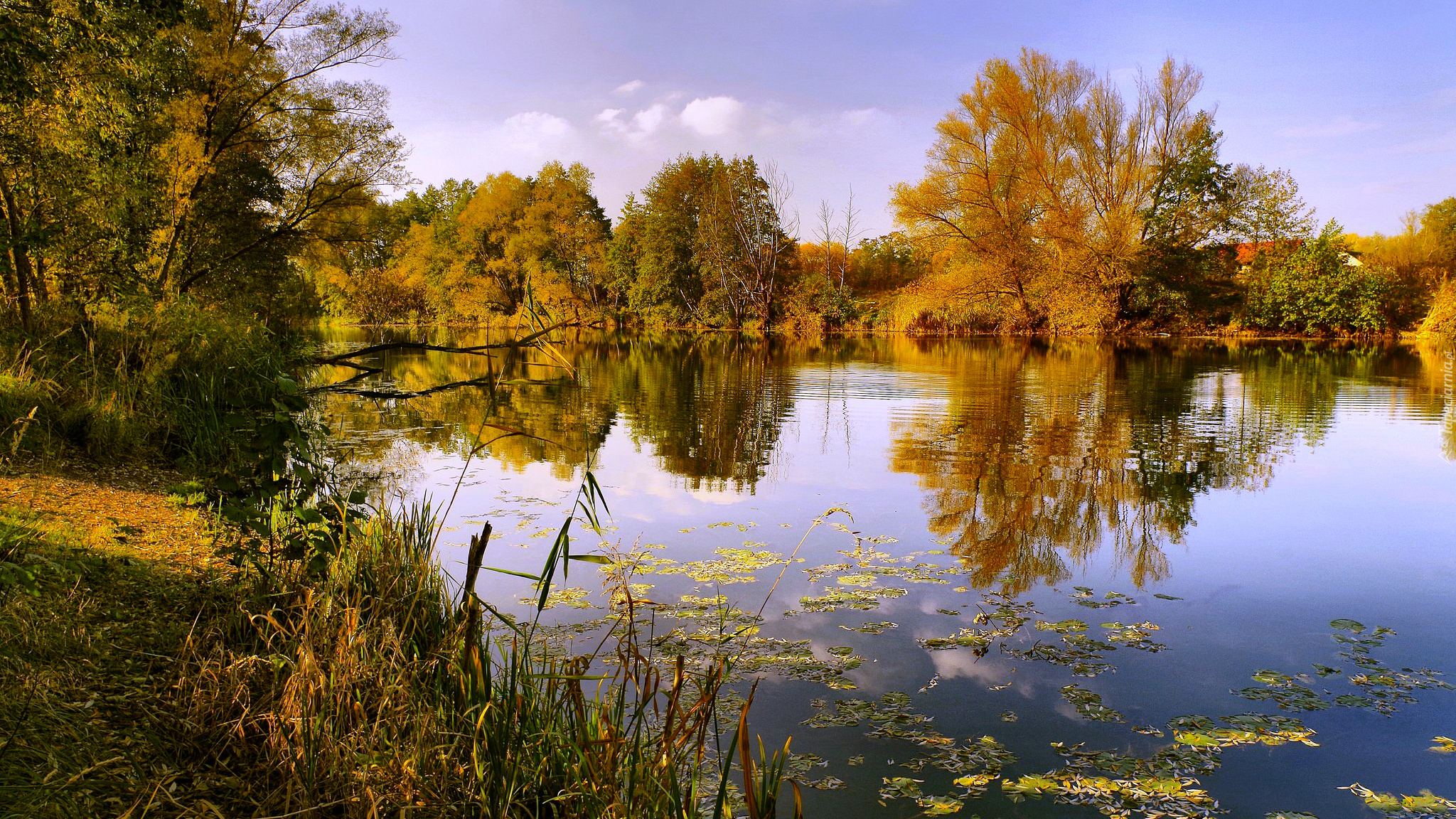 Edytor tapety: Jesienne drzewa odbijają się w jeziorze porośniętym trzciną