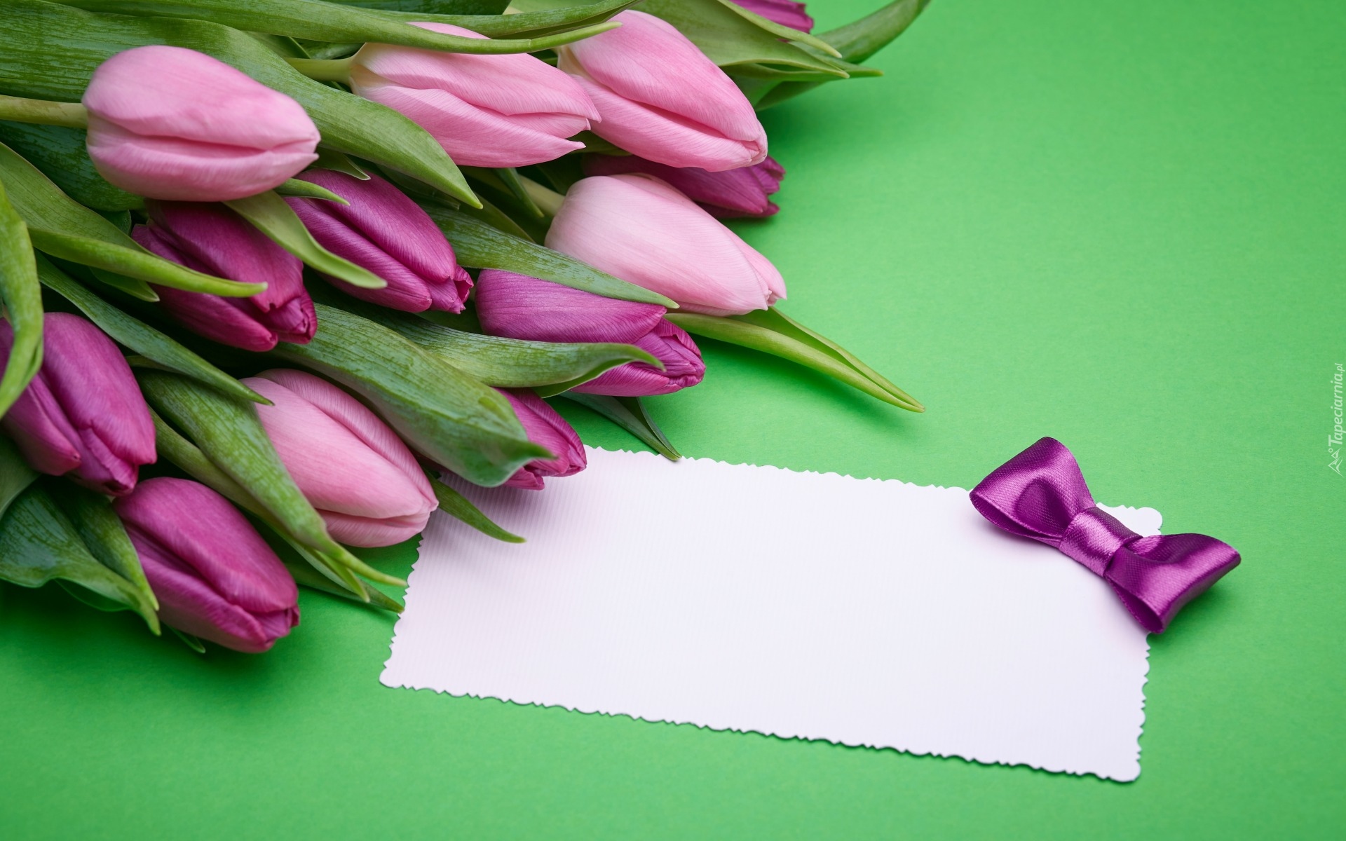 Edytor tapety: Bukiet fioletowych tulipanów obok białej karteczki z kokardką