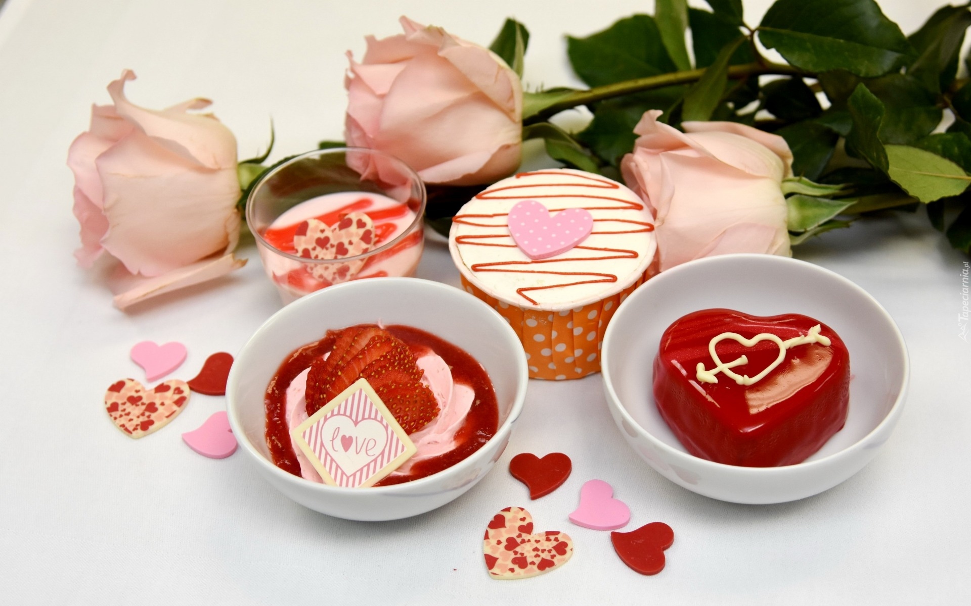 Edytor tapety: Kompozycja deserów w miseczkach obok róż i serduszek