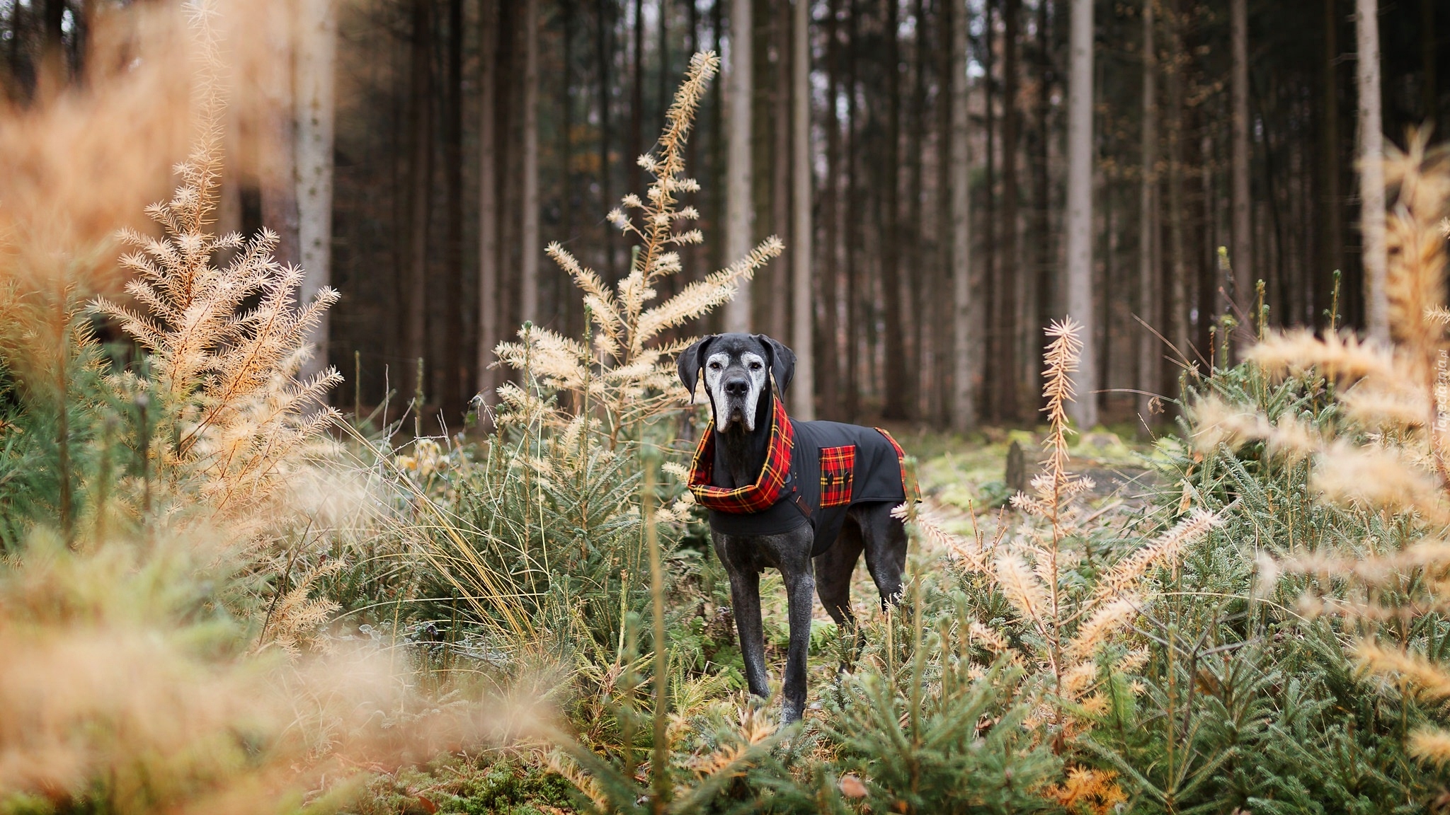 Edytor tapety: Wiekowy dog niemiecki na spacerze w lesie