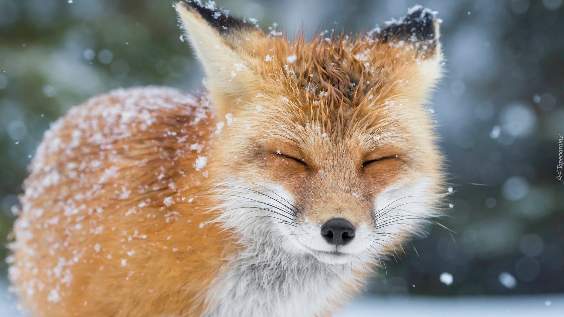 Edytor tapety: Rudy lis z zamkniętymi oczami wśród sypiącego śniegu