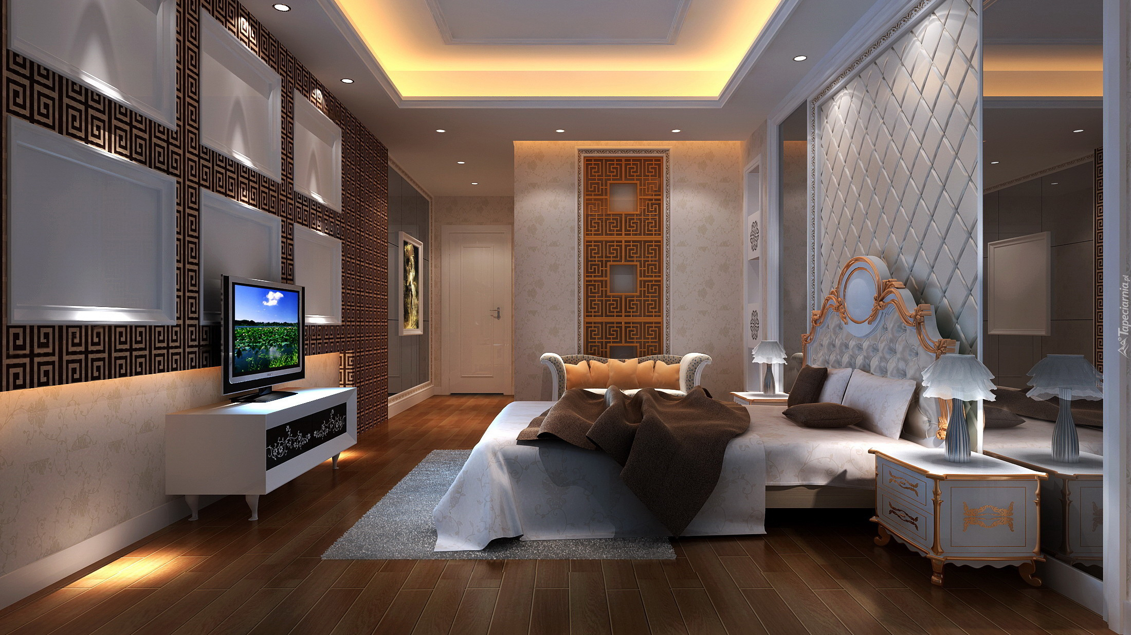 Edytor tapety: Wnętrze sypialni z łóżkiem i telewizorem