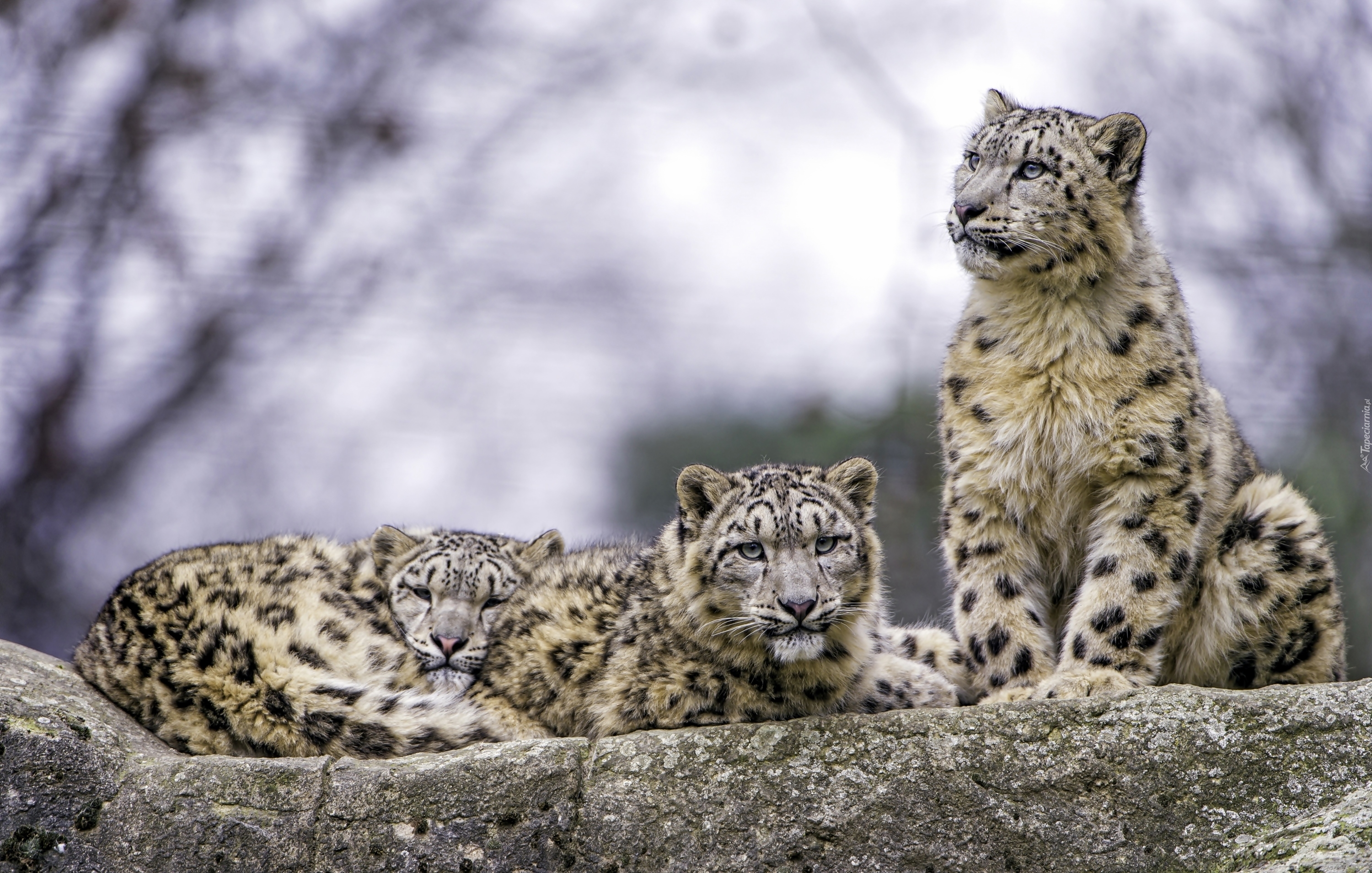 Edytor tapety: Trzy irbisy odpoczywają na skale