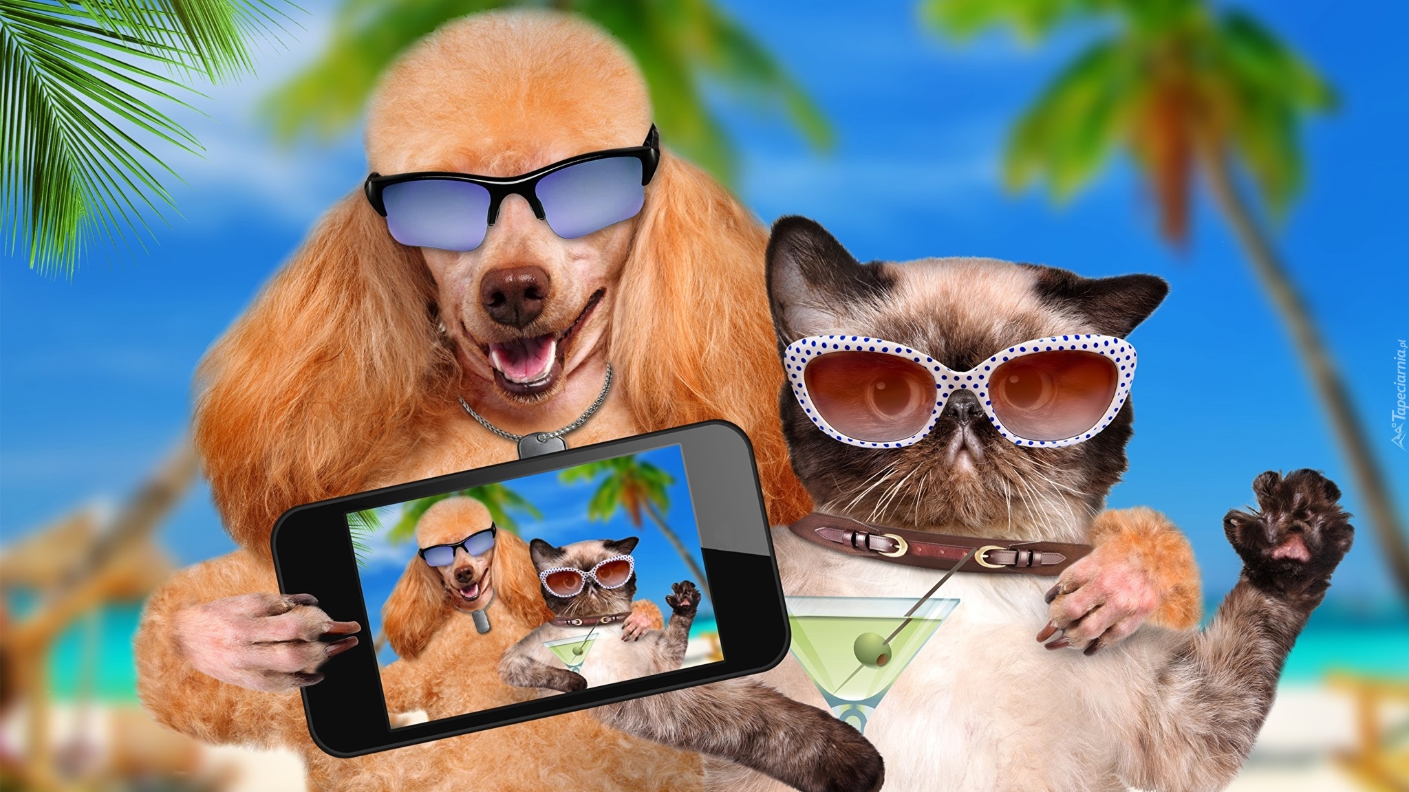 Edytor tapety: Kot i pies w okularach pozują do selfie
