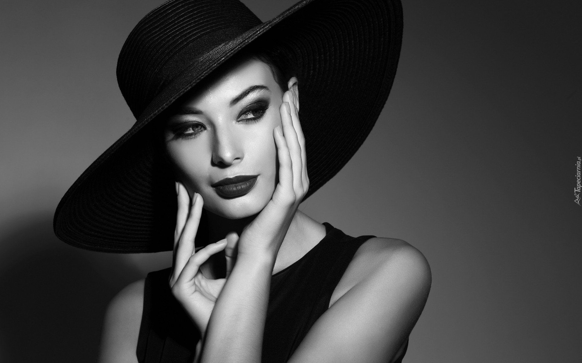 Edytor tapety: Czarno-białe zdjęcie eleganckiej kobiety w kapeluszu