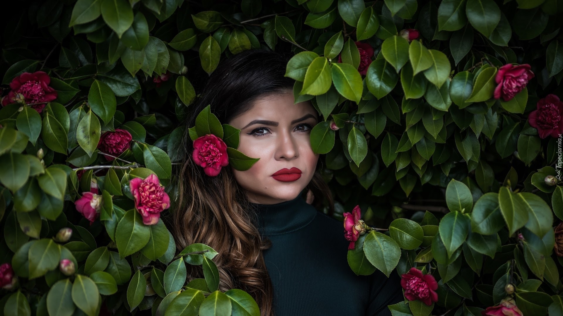 Edytor tapety: Kobieta pośród kwiatów i liści