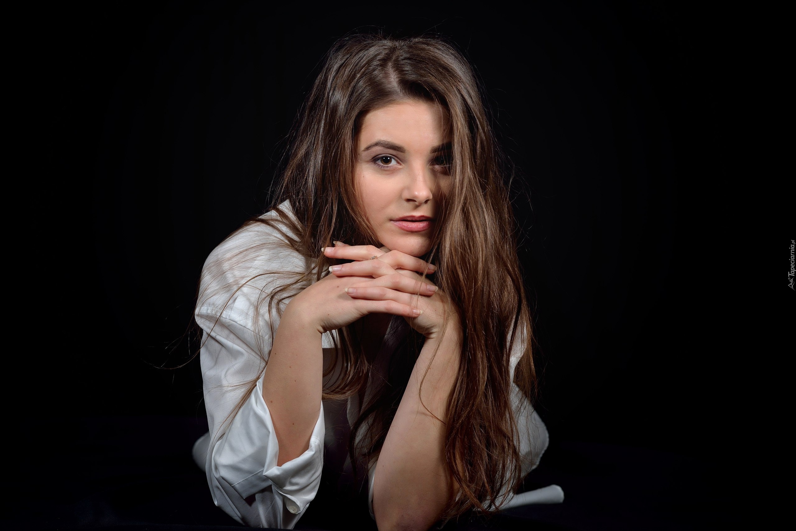 Edytor tapety: Długowłosa dziewczyna w koszuli pozuje do zdjęcia