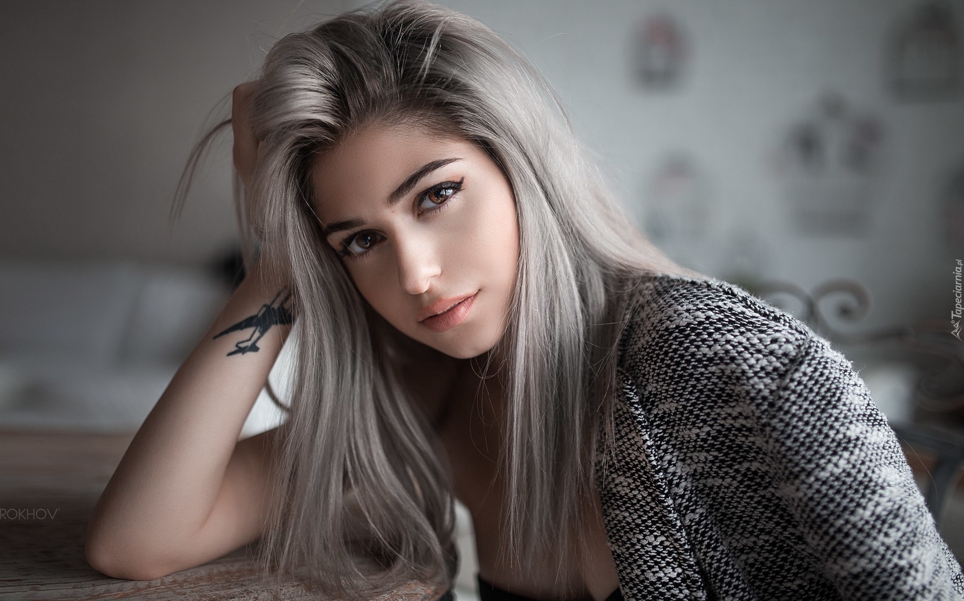 Edytor tapety: Kobieta o popielatych włosach z tatuażem na ręce