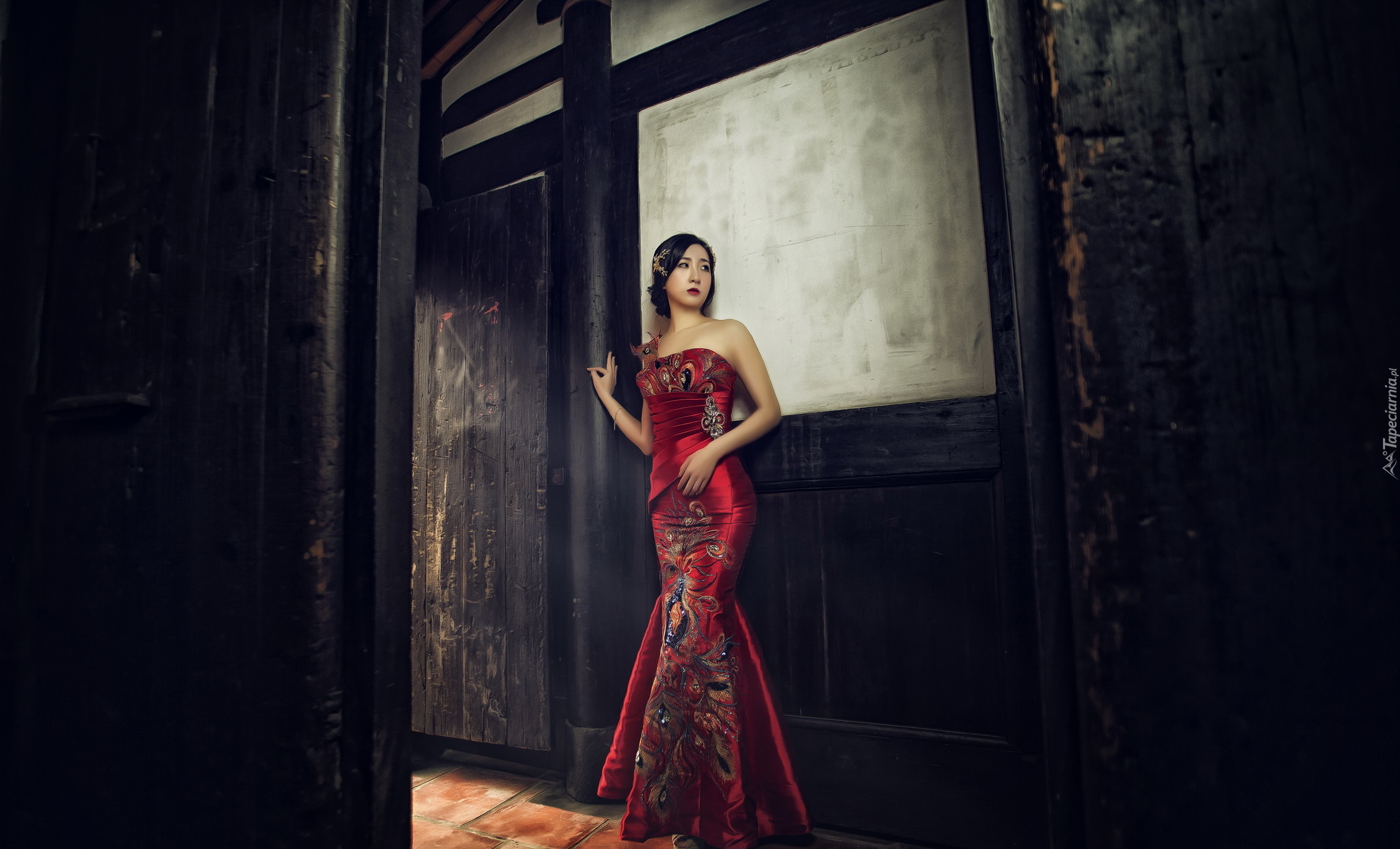 Edytor tapety: Azjatka w długiej wizytowej czerwonej sukni
