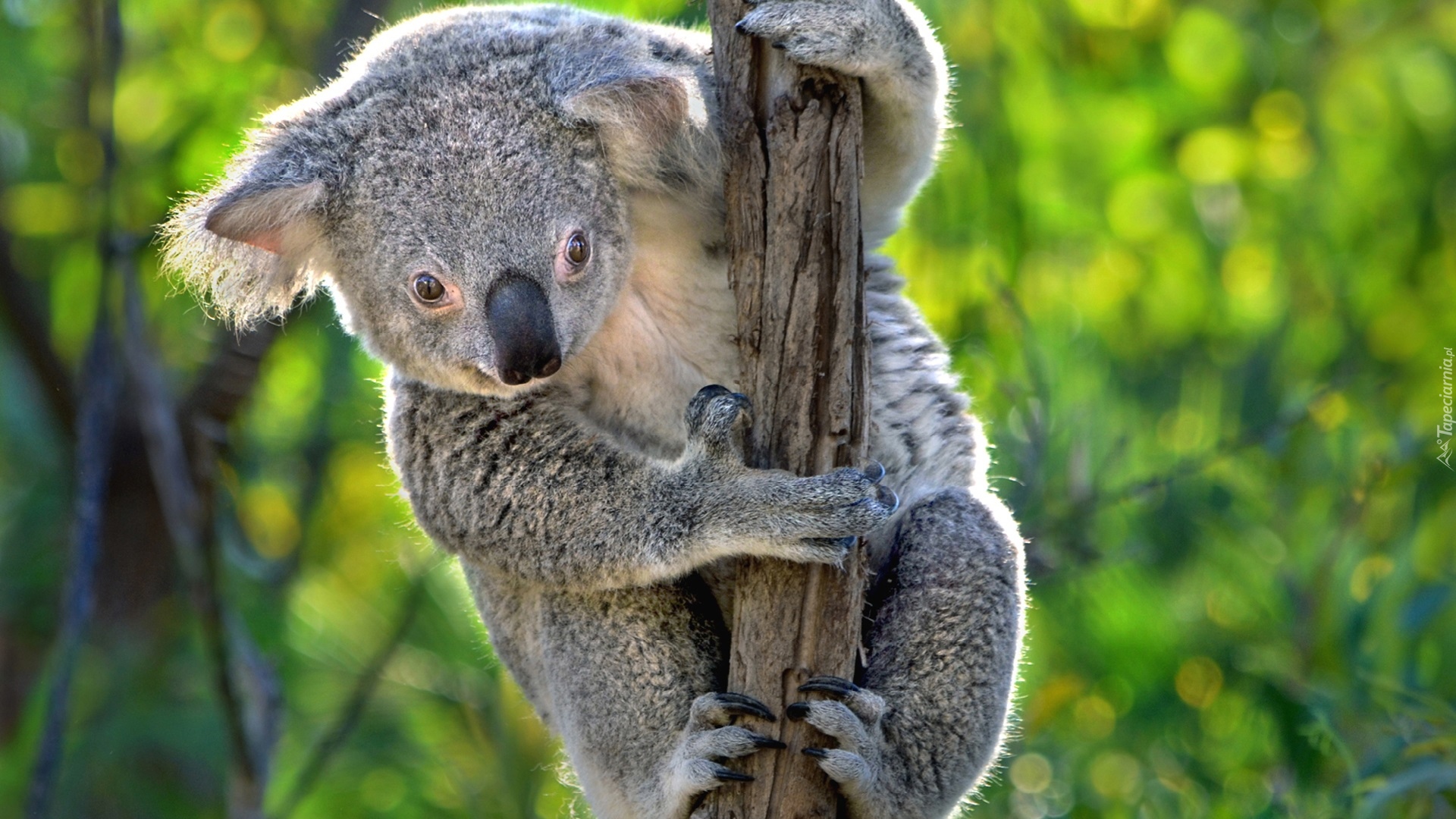 Edytor tapety: Trzymający się gałęzi miś koala spogląda w dół