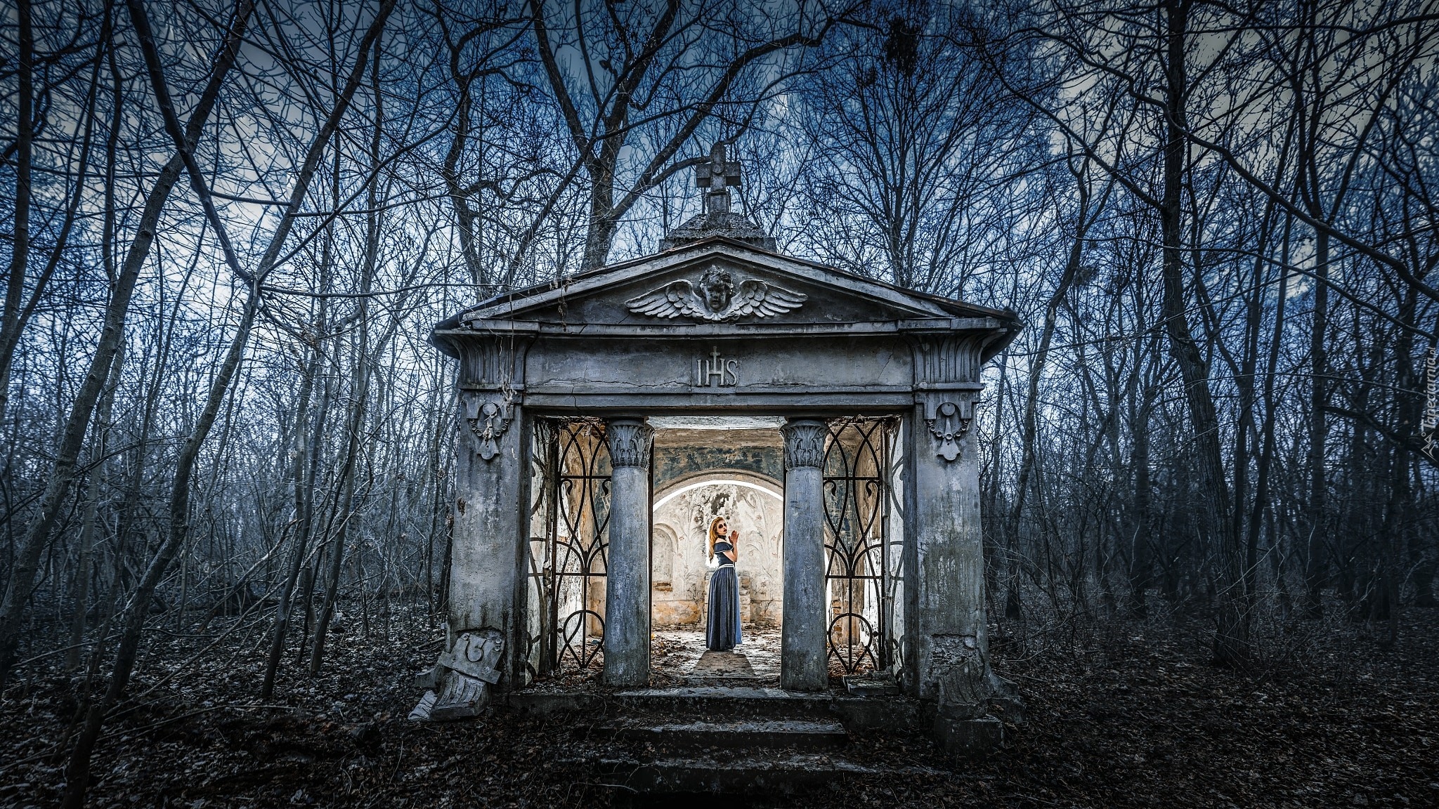 Edytor tapety: Modląca się kobieta w leśnej krypcie