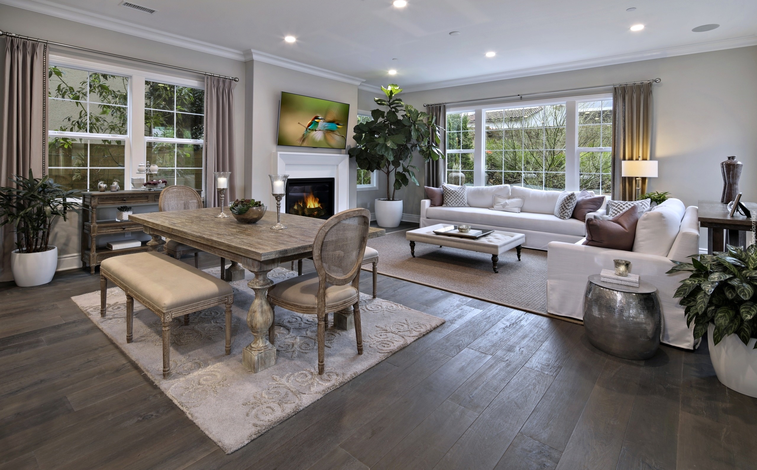 Edytor tapety: Wnętrze salonu z jadalnią i kominkiem