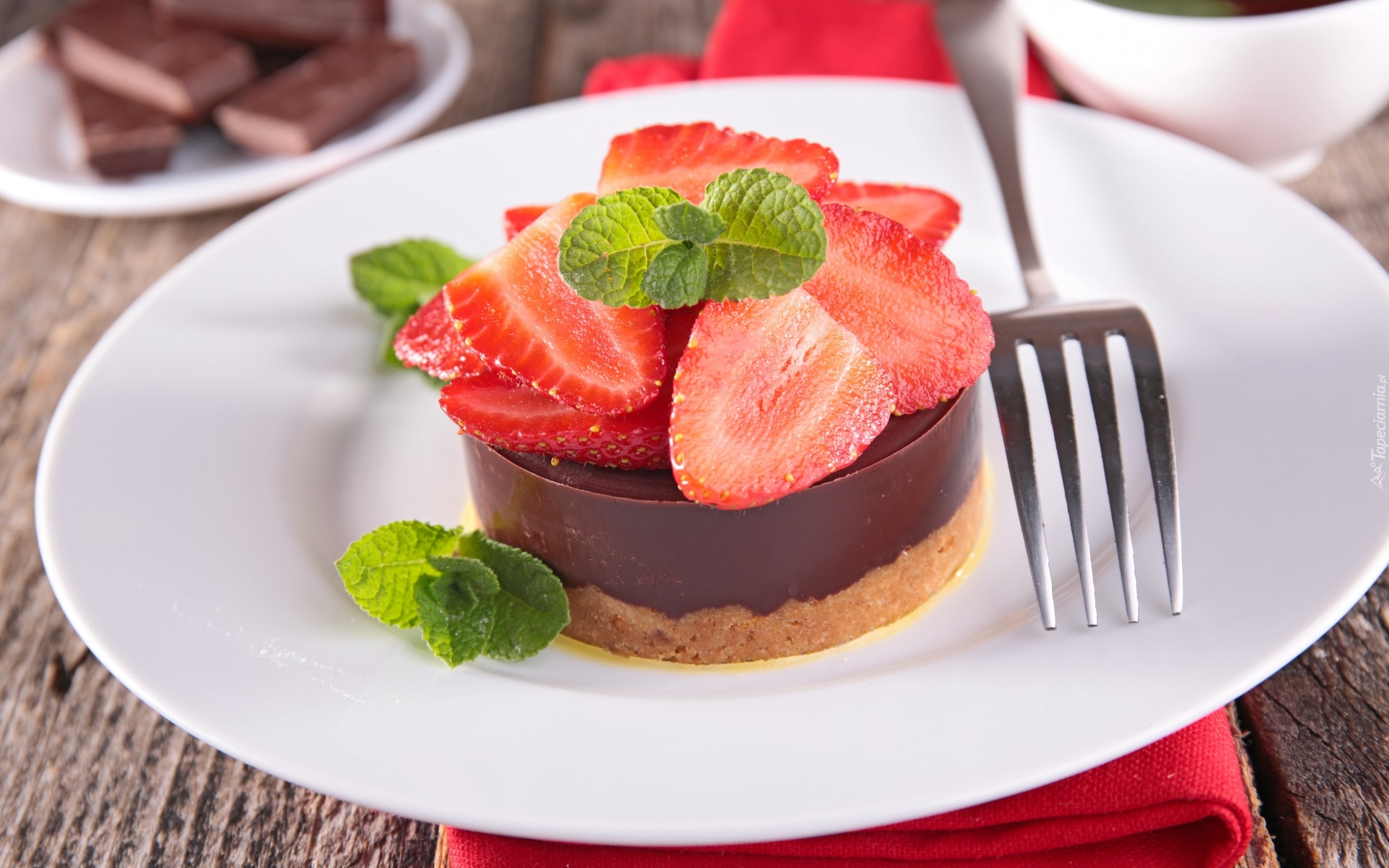 Edytor tapety: Deser czekoladowy udekorowany truskawkami i listkami