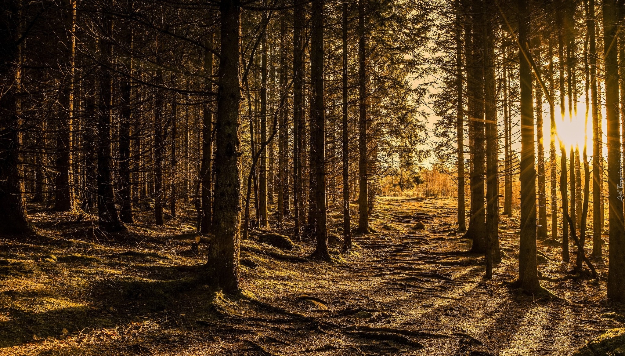 Edytor tapety: Promienie słońca przebijają się przez drzewa do lasu