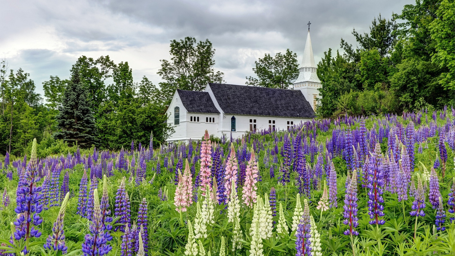 Edytor tapety: Kościółek na wzgórzu porośniętym łubinem