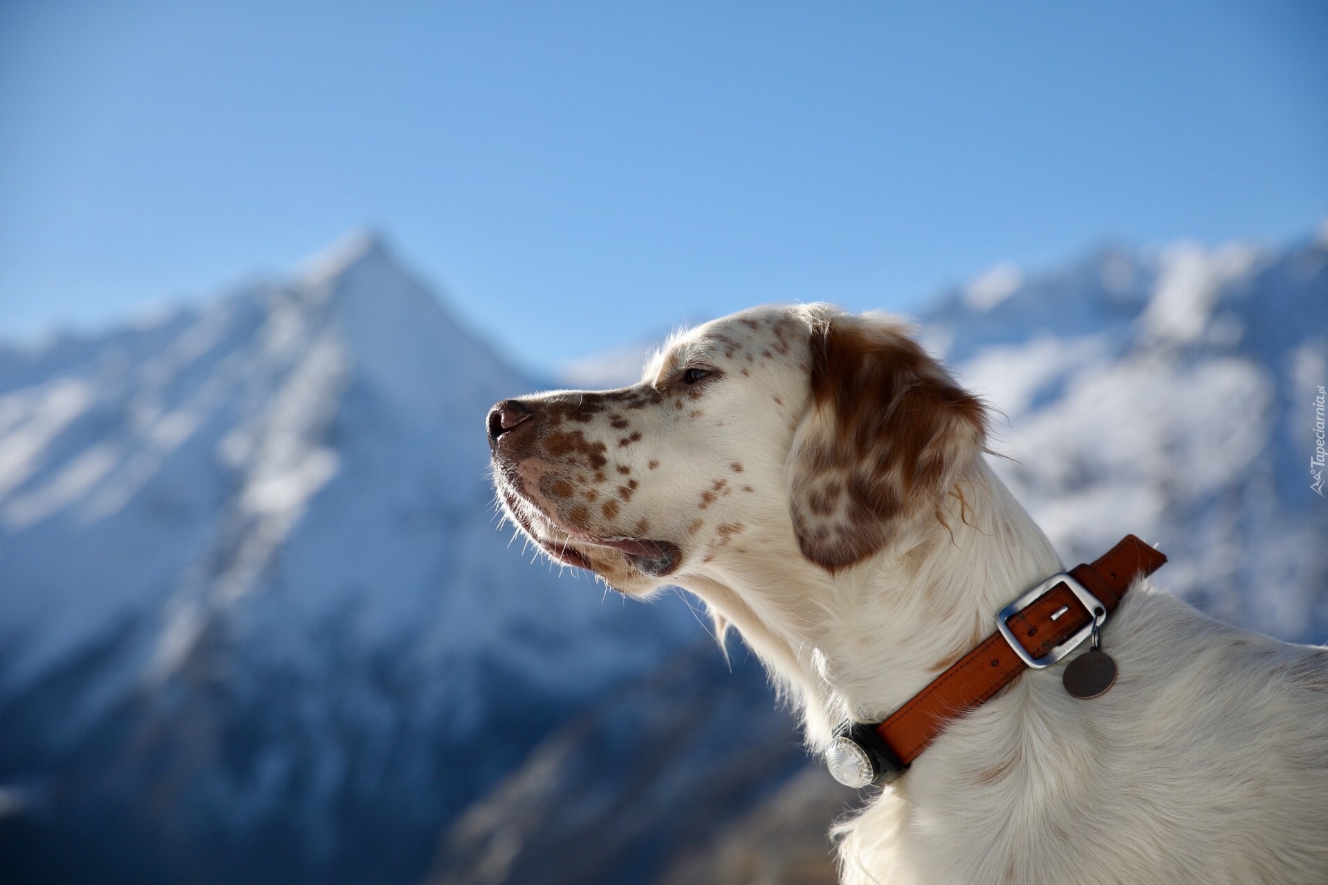 Edytor tapety: Seter angielski z obrożą na tle górskiego krajobrazu