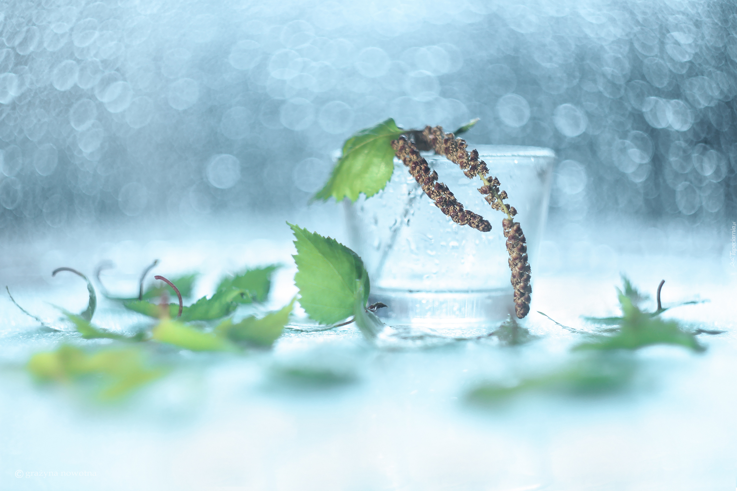 Edytor tapety: Liście brzozy na szklanym wazoniku i obok